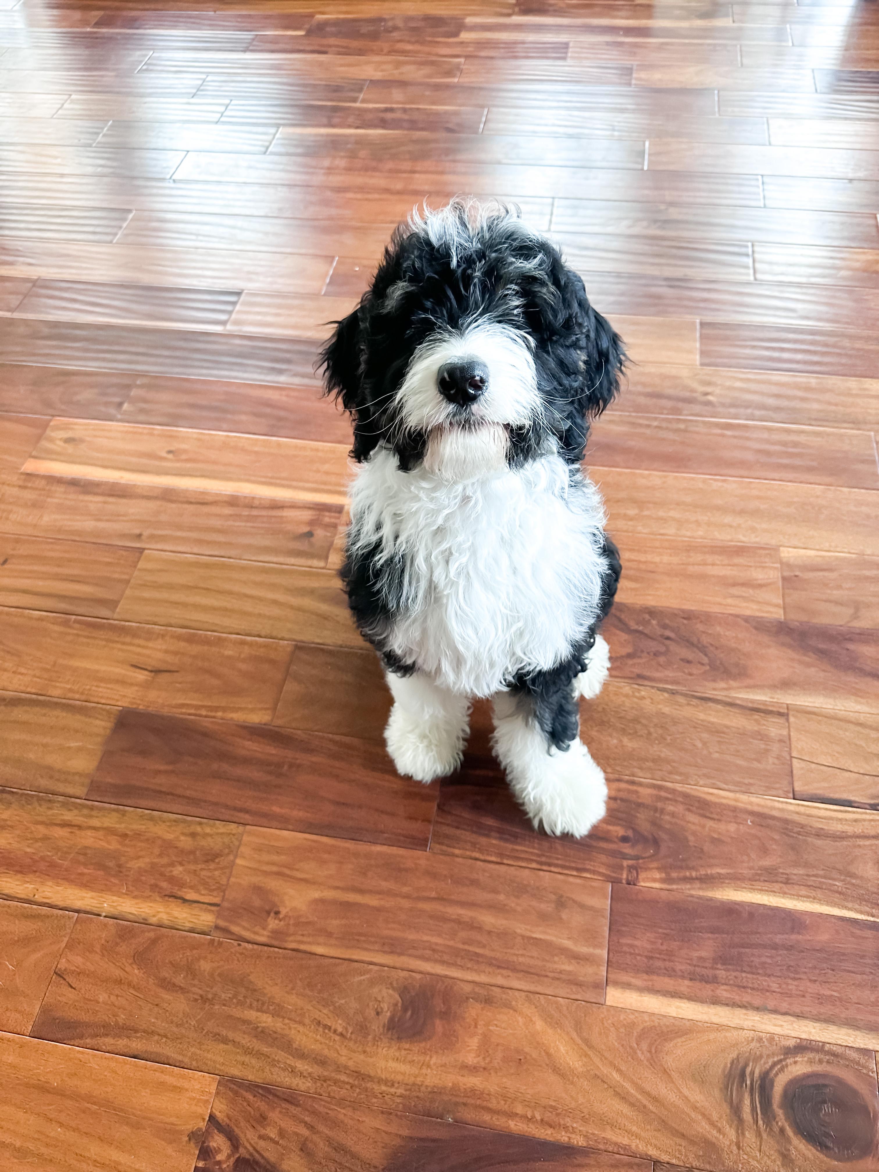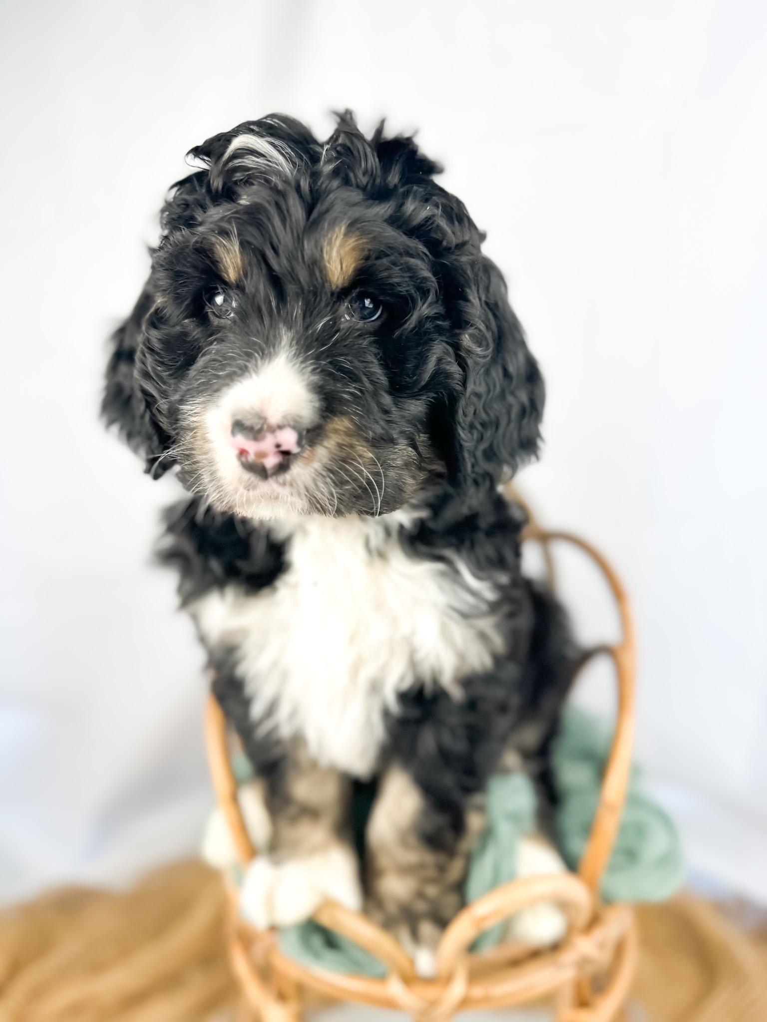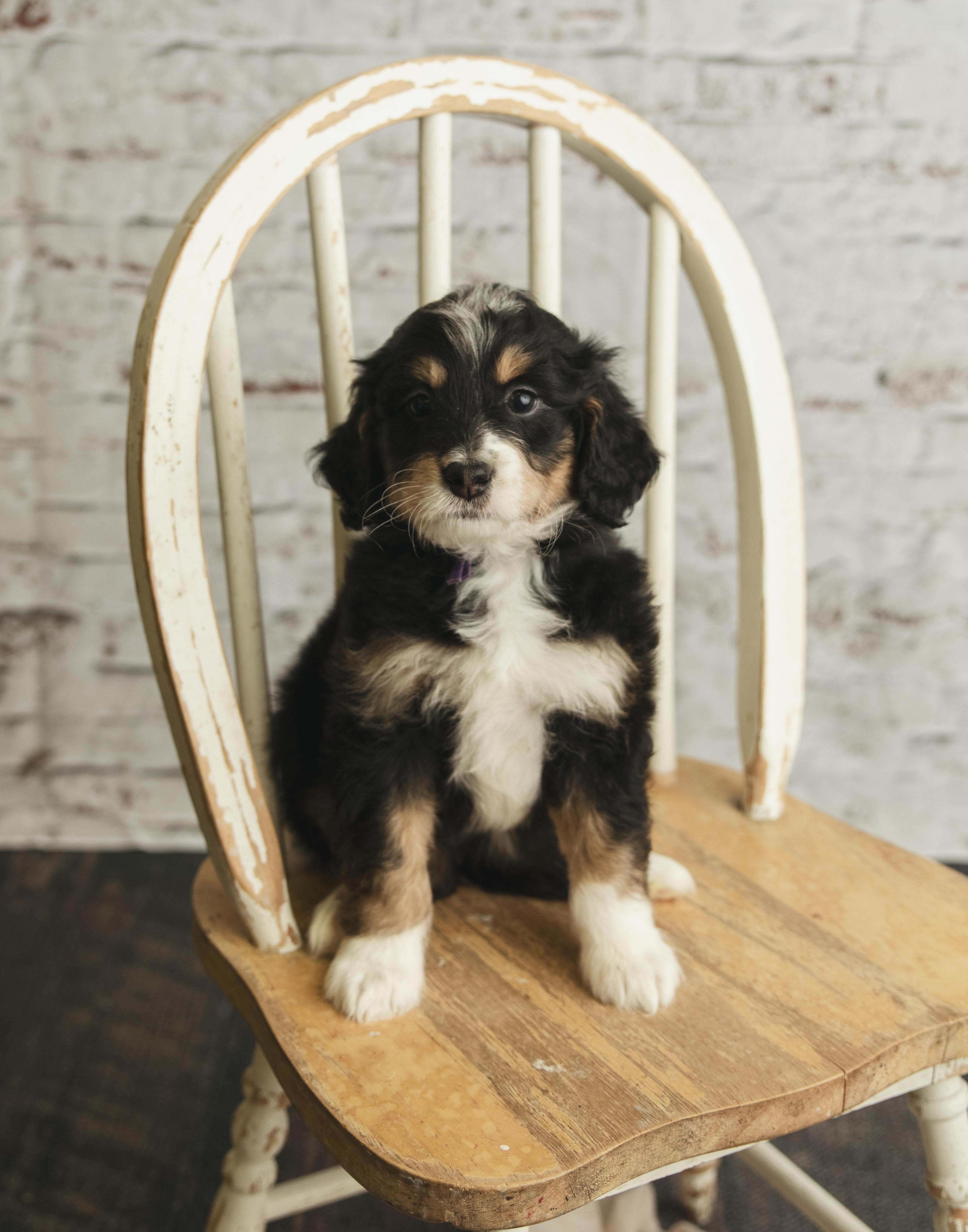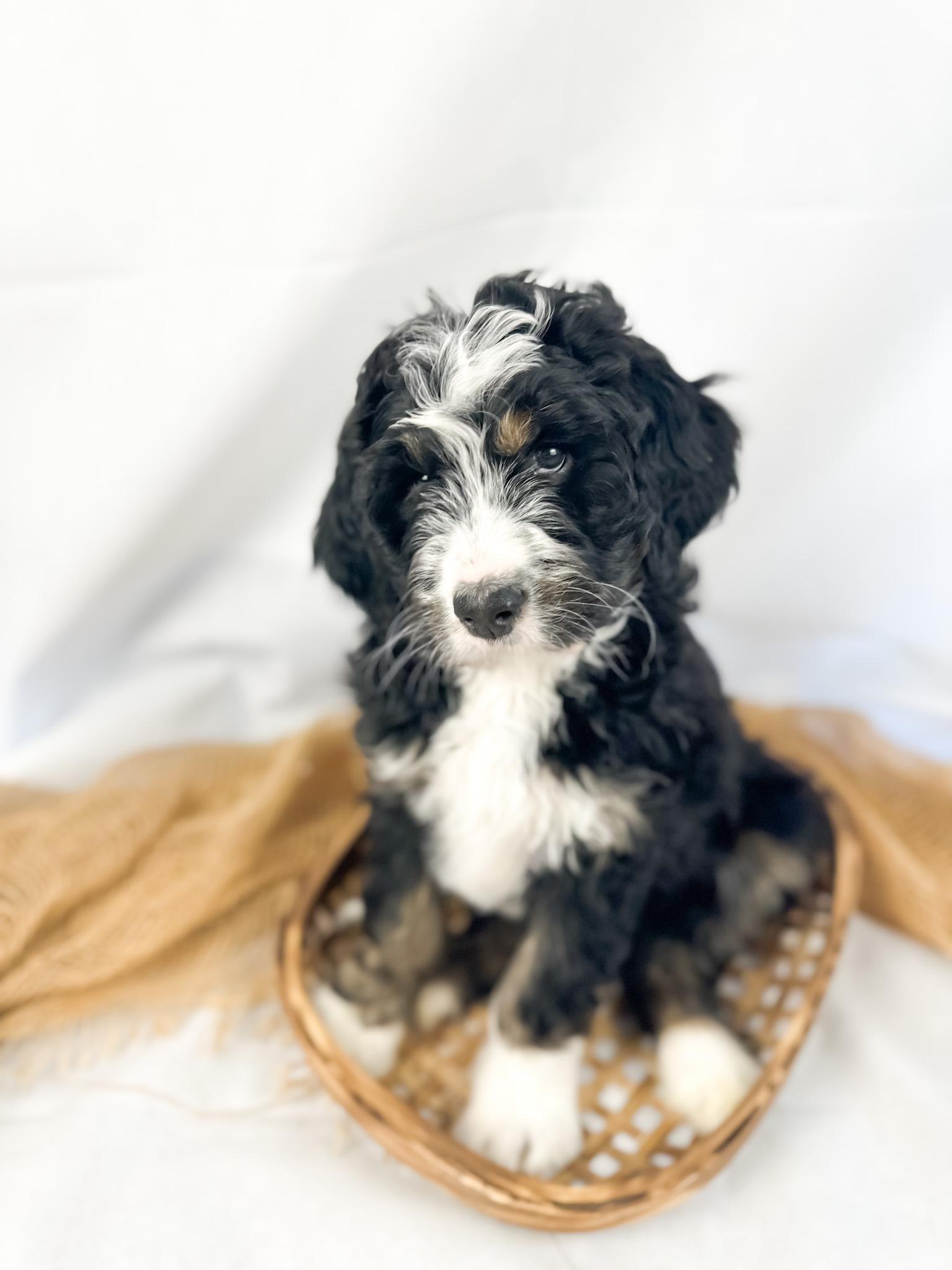 Our Bernedoodle puppies include sable, black and white, tri-color, phantom, and merle. Colors will vary depending on the parent dogs.