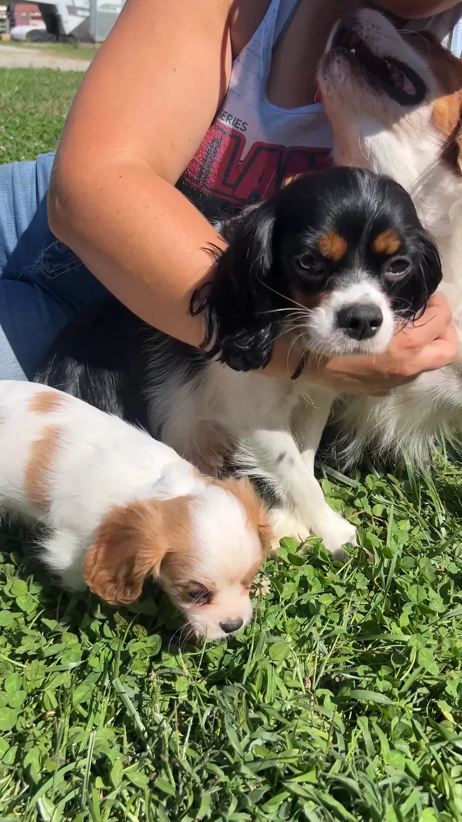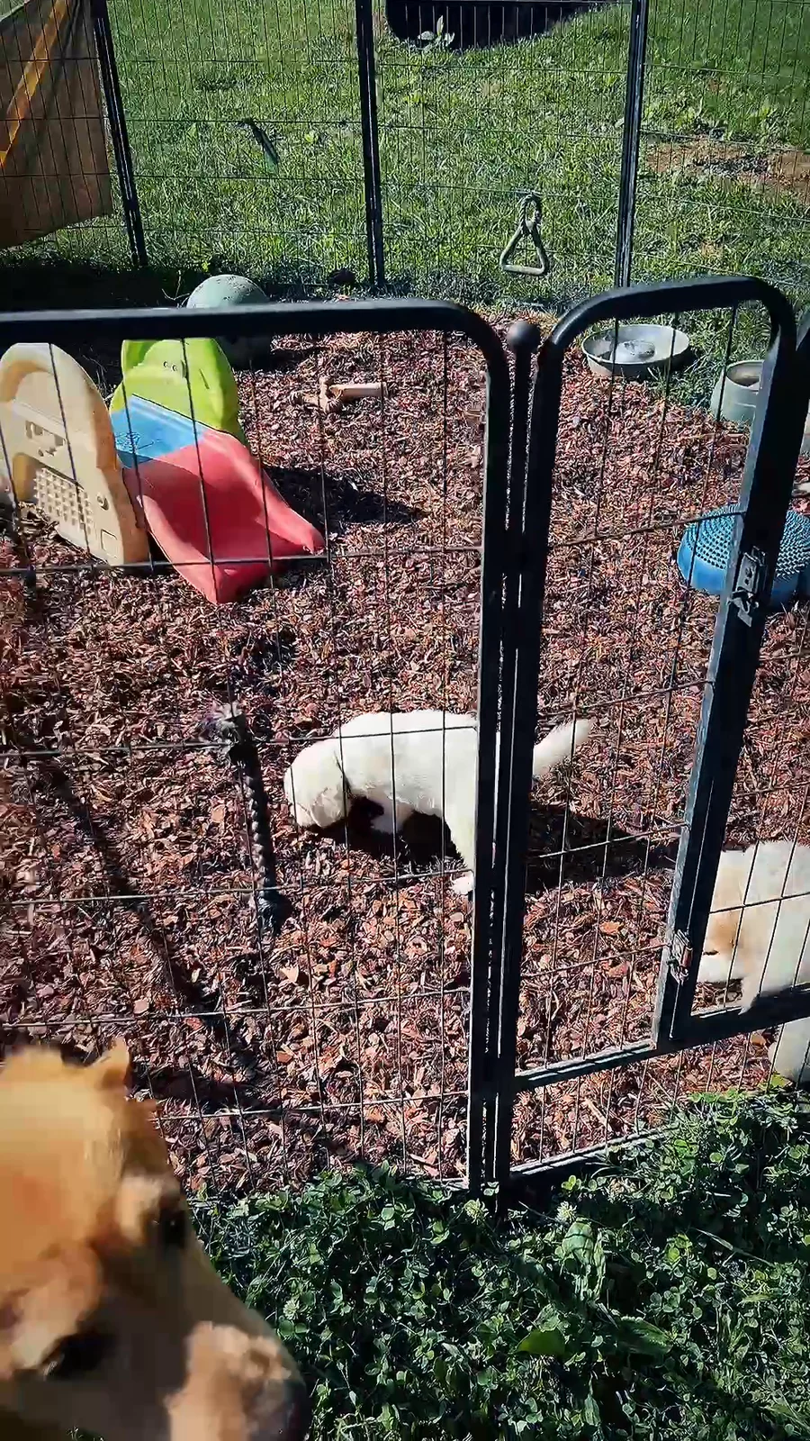 Frankie and Cooper outside playing with their puppies at 8 weeks of age.