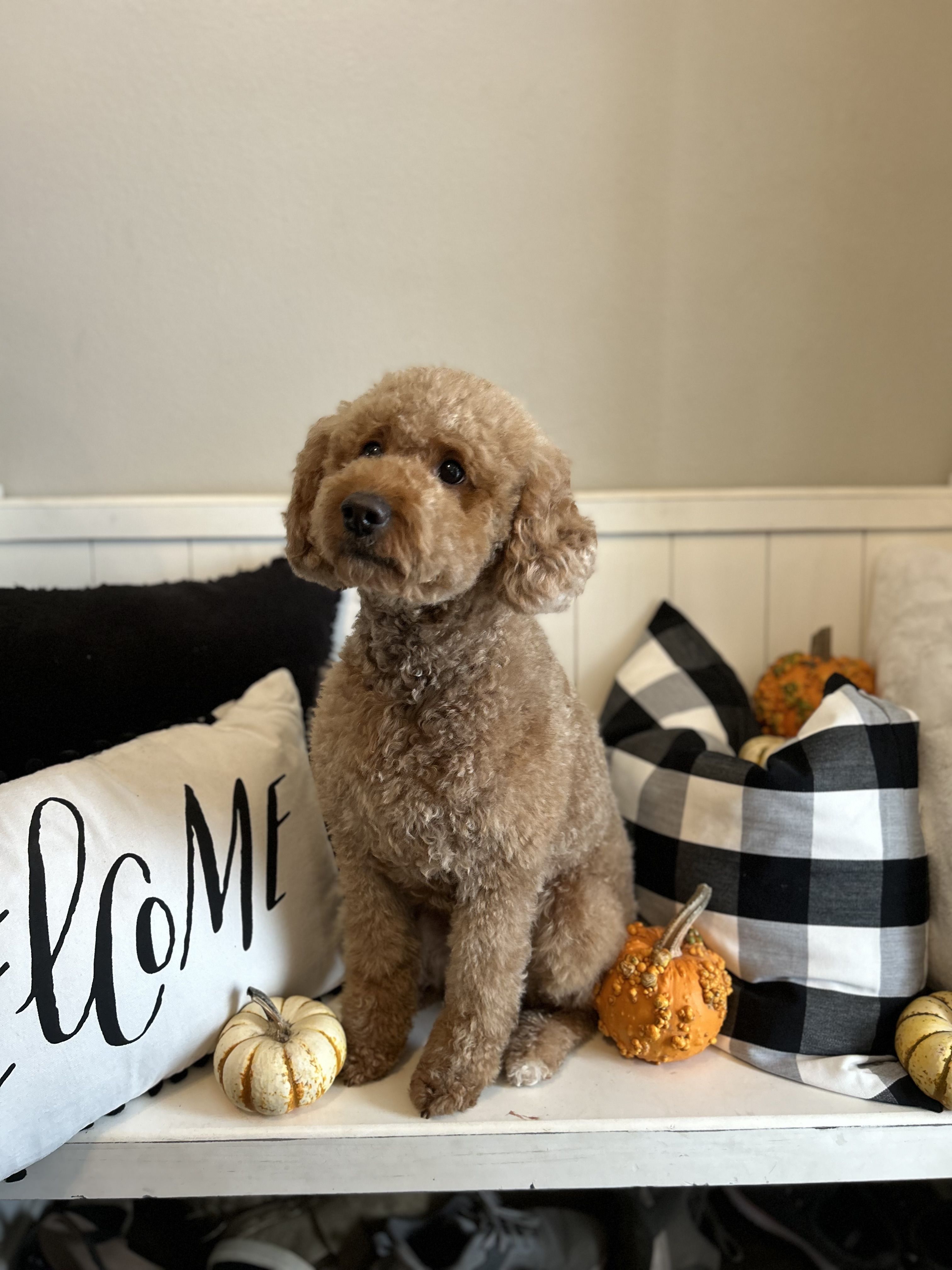 May is a female Aussiedoodle. Carefully selected as a great representative of her breed, Angie decided to make her part of their program. Angie has passed Good Dog’s screening process, which involved a review of their breeding practices, environment, and the mental and physical health of their dogs.