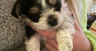 Our Yorkshire Terrier puppies are parti. Toy Australian Shepherd puppies are black tri. Colors will vary depending on the parent dogs.