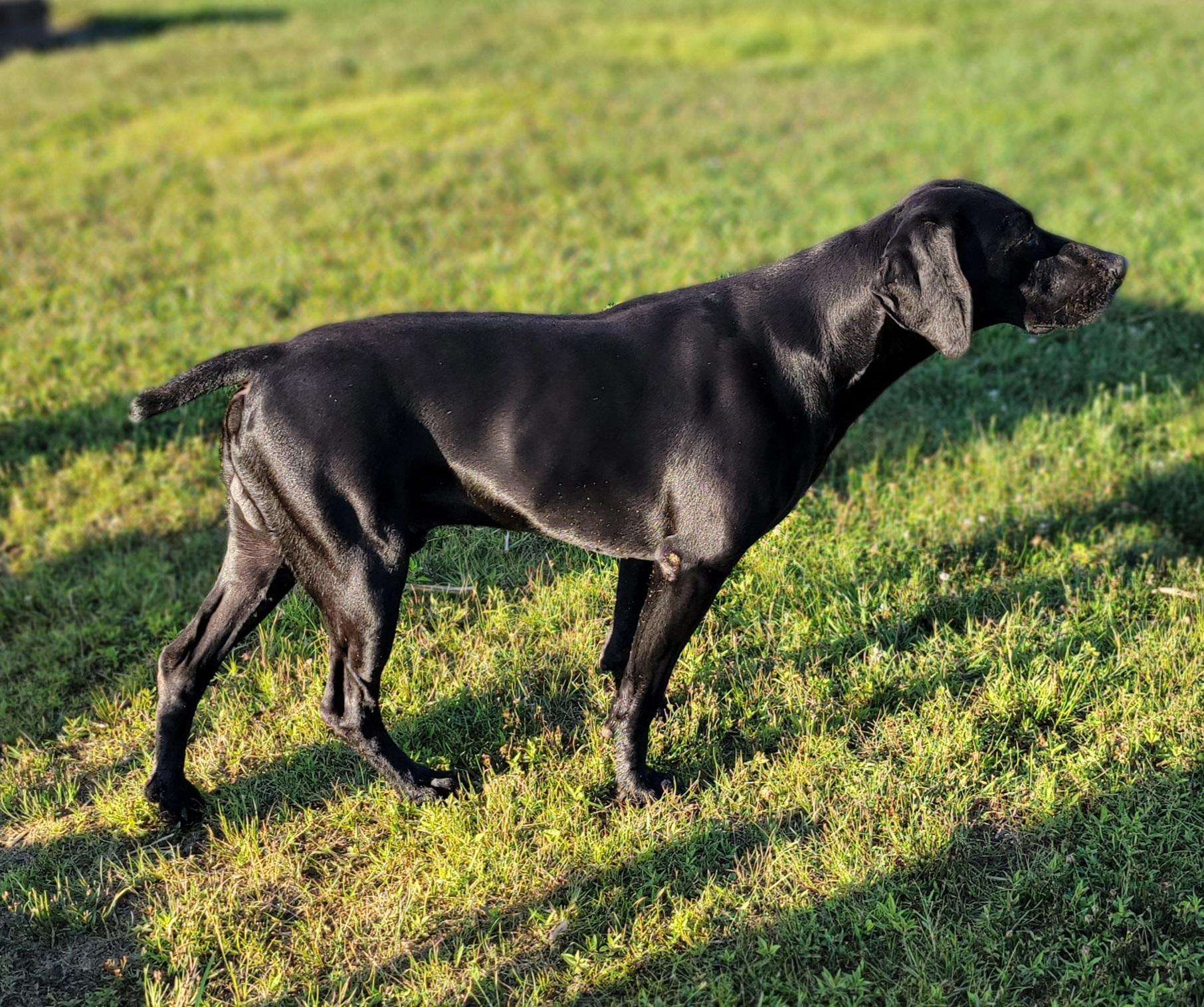 Jasmine is a a soft mannered, calm female. She is great in the house, well mannered, and eager to meet new people. This girl is extremely loving. Jasmine is a close working girl, with her nose always on and a strong natural instinct to find birds. She isn't afraid to go in the water for retrieves. Jasmine comes from strong German lines going back to Von Hege Haus, Shooting Starr, and more. She has the old German head line, square, with big ole ears. Jasmine weighs 56 pounds and is 24" tall.
