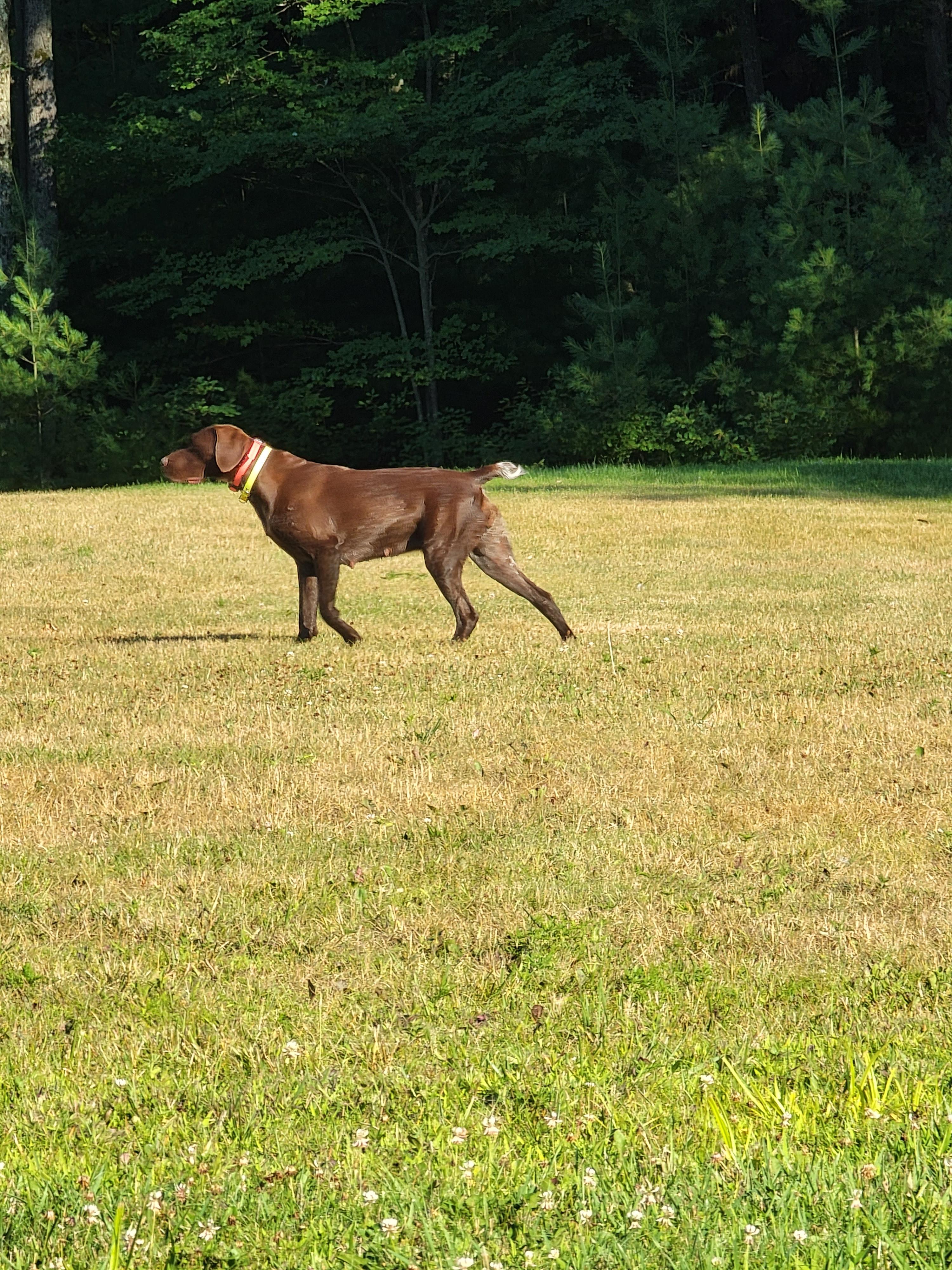 Opal is a gentle soul and a pleasure to hunt behind. Opal is truly a foot hunting dog, staying close, checking in and quartering nicely. Opal has been on chucker, grouse, woodcock, and pheasants. She is great in the house, well mannered and soft tempered. This girl's goal is to please, be it in the field or house. She is definitely a loyal and dedicated female. Opal weighs 61 pounds and is 24" tall.