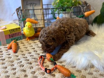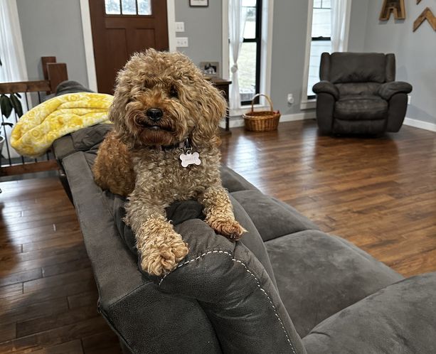 Mags is a female Goldendoodle. Carefully selected as a great representative of her breed, Ashley decided to make her part of their program. Ashley has passed Good Dog’s screening process, which involved a review of their breeding practices, environment, and the mental and physical health of their dogs.