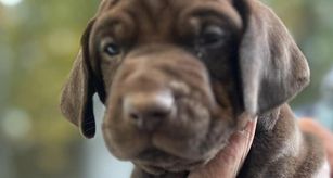 Our German Shorthaired Pointer puppies include liver roan, liver, liver and white, and black roan. Wirehaired Pointing Griffon puppies include chestnut and gray and brown and gray. Colors will vary depending on the parent dogs.