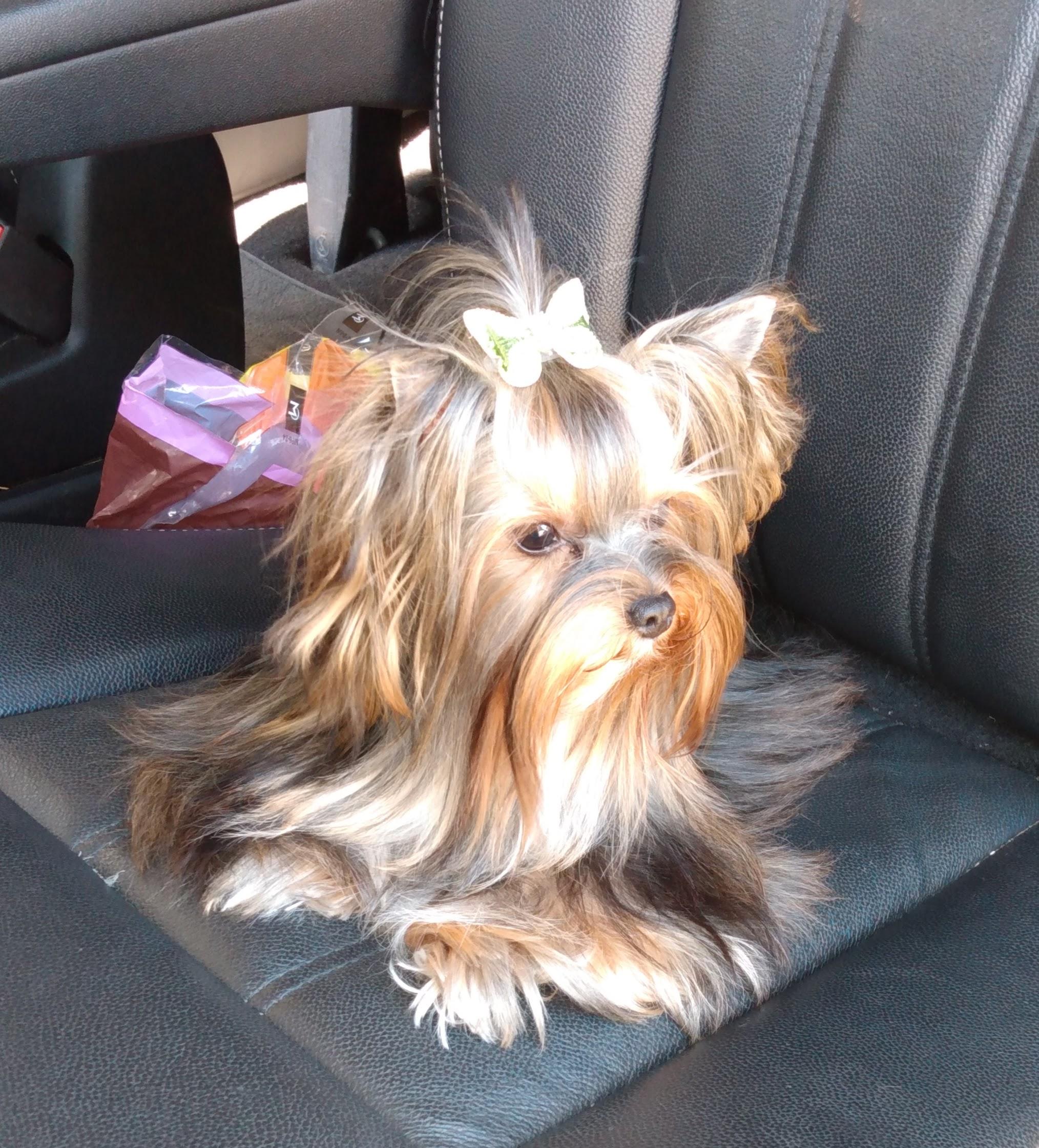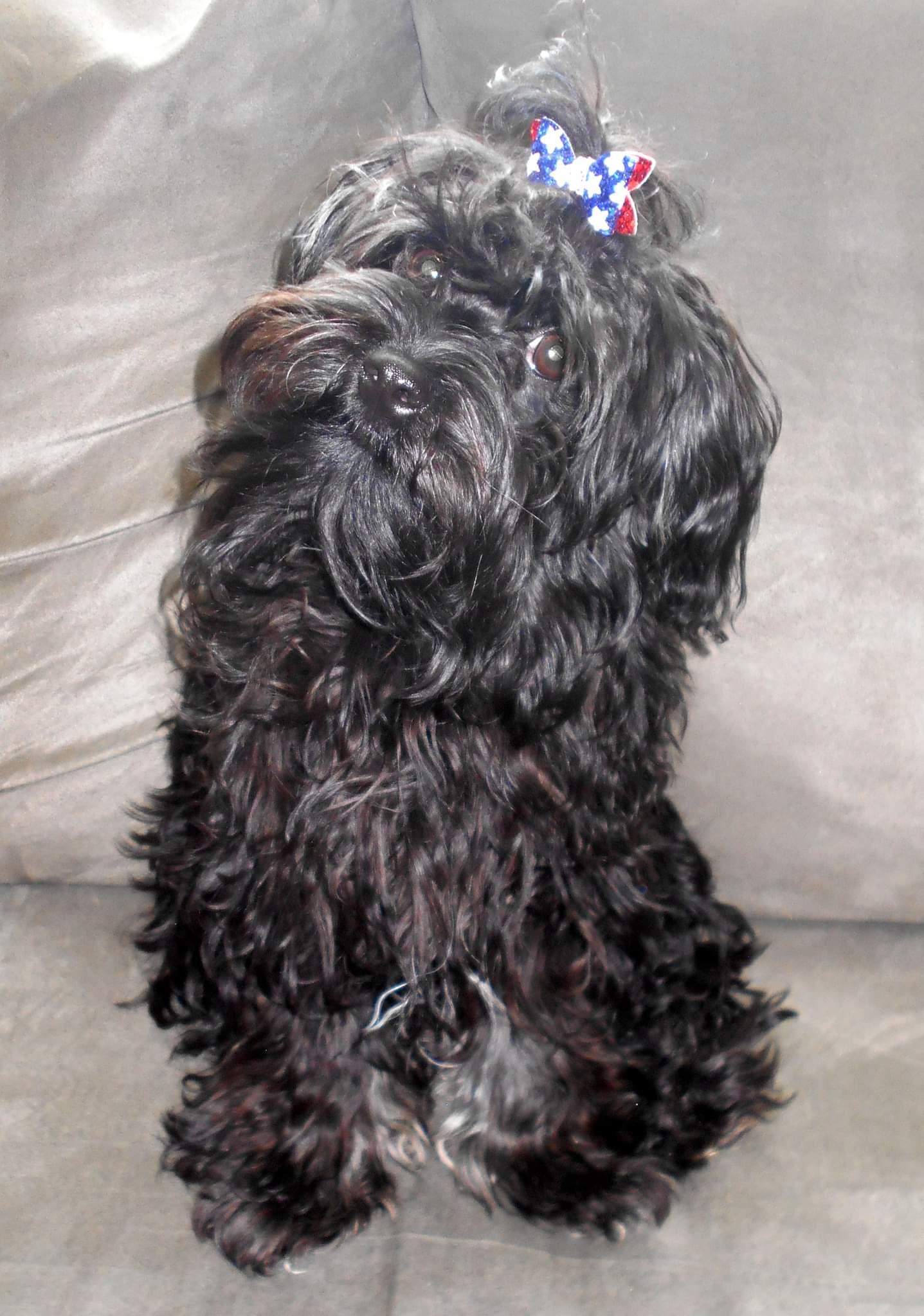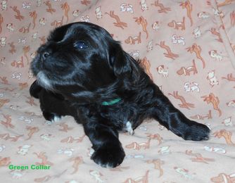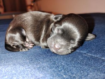 Sapphire is black with silver markings. She is just the sweetest and most mild mannered little girl. Her tail always wags and she is very happy-go-lucky. She squeaks when excited to see us and wiggles all over the place.