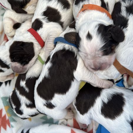 Our puppies include black and white and liver white and tan. Colors will vary depending on the parent dogs.