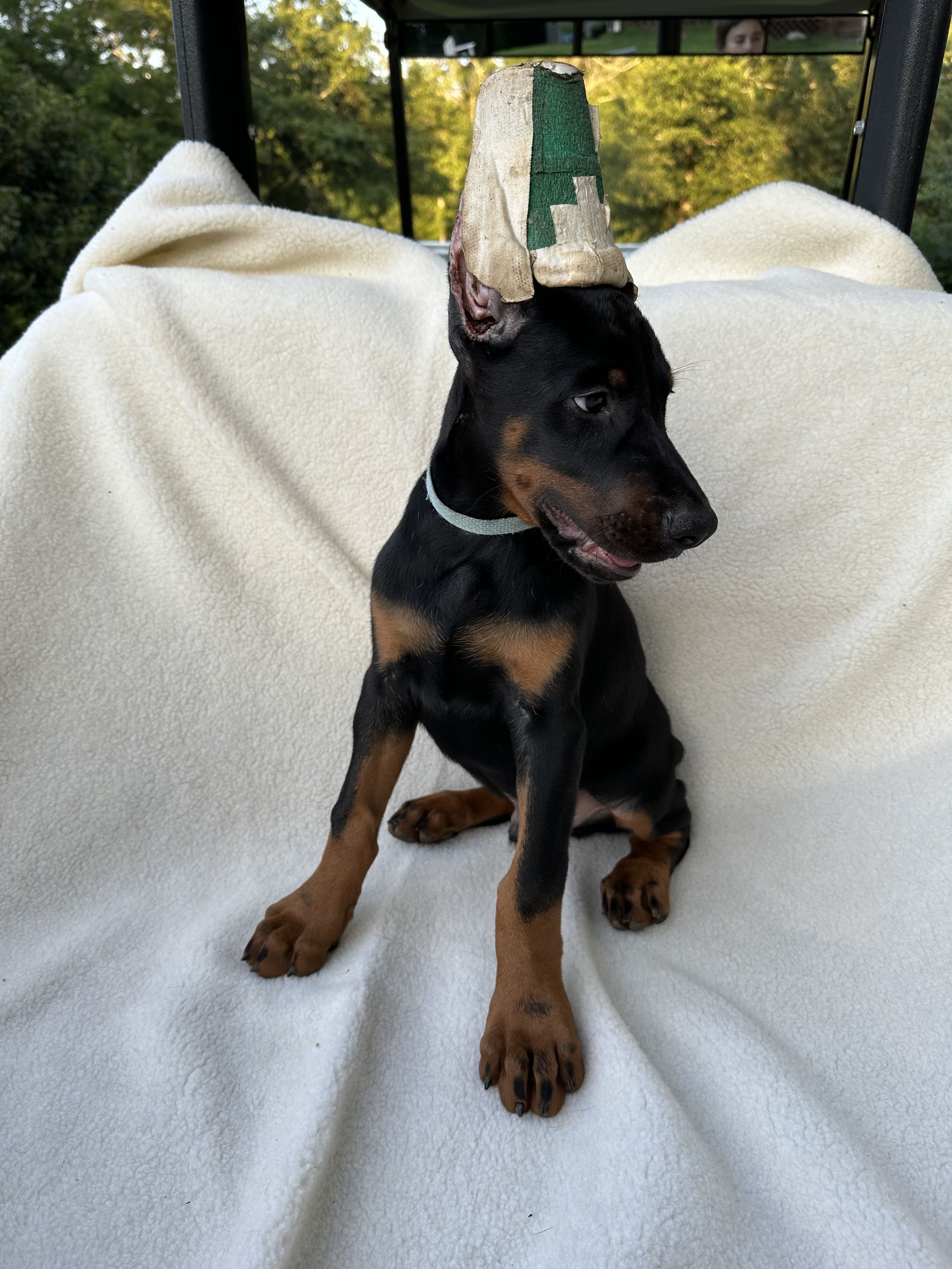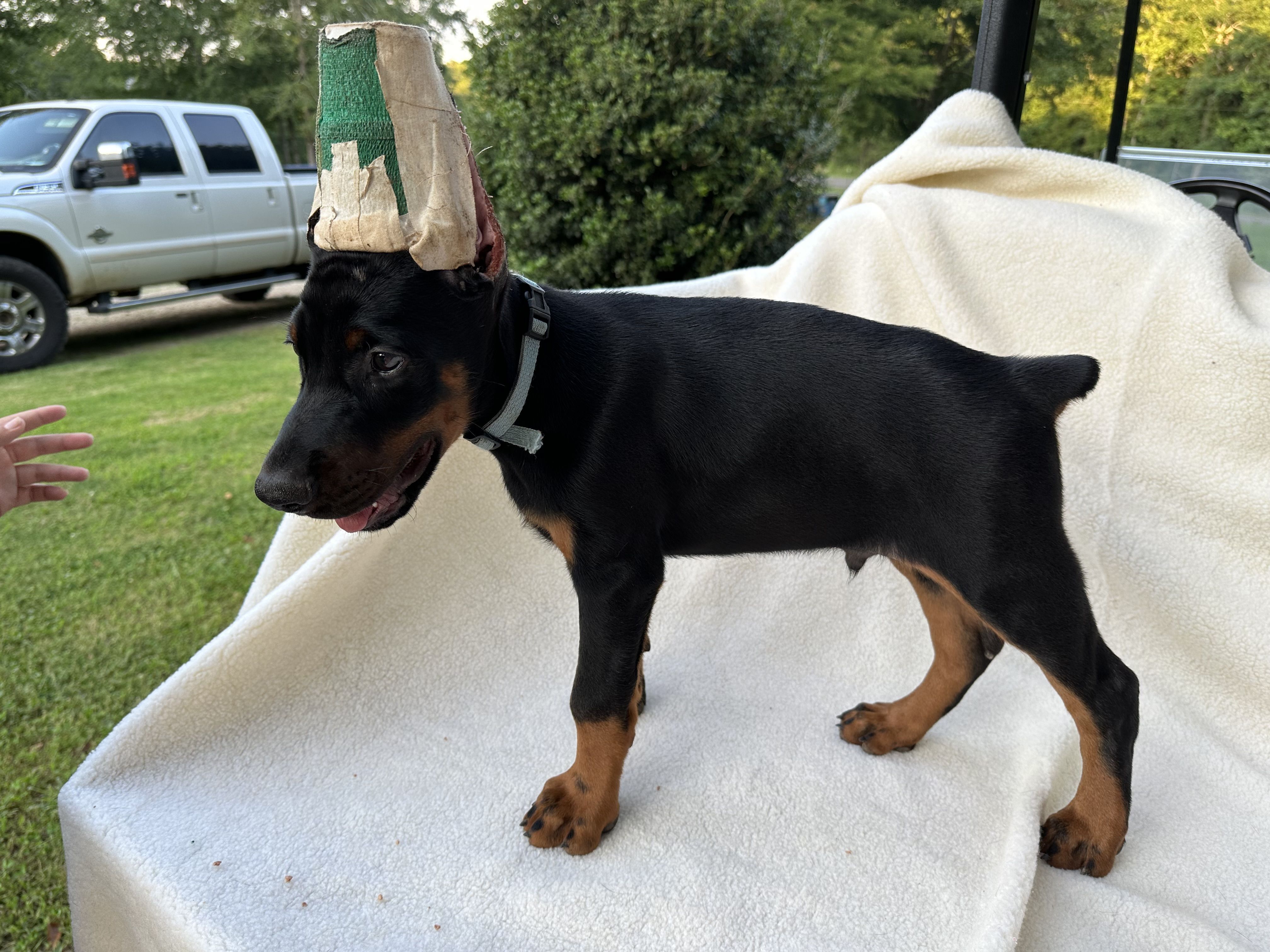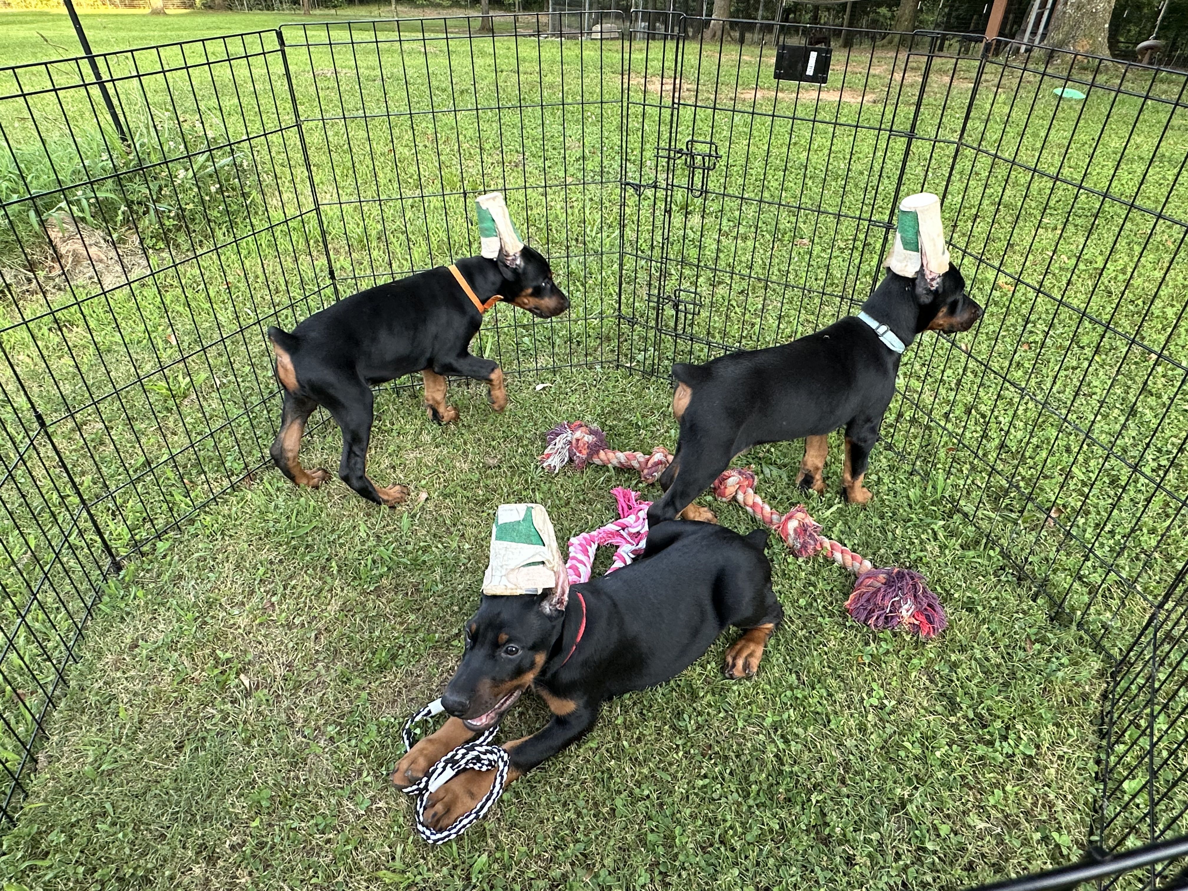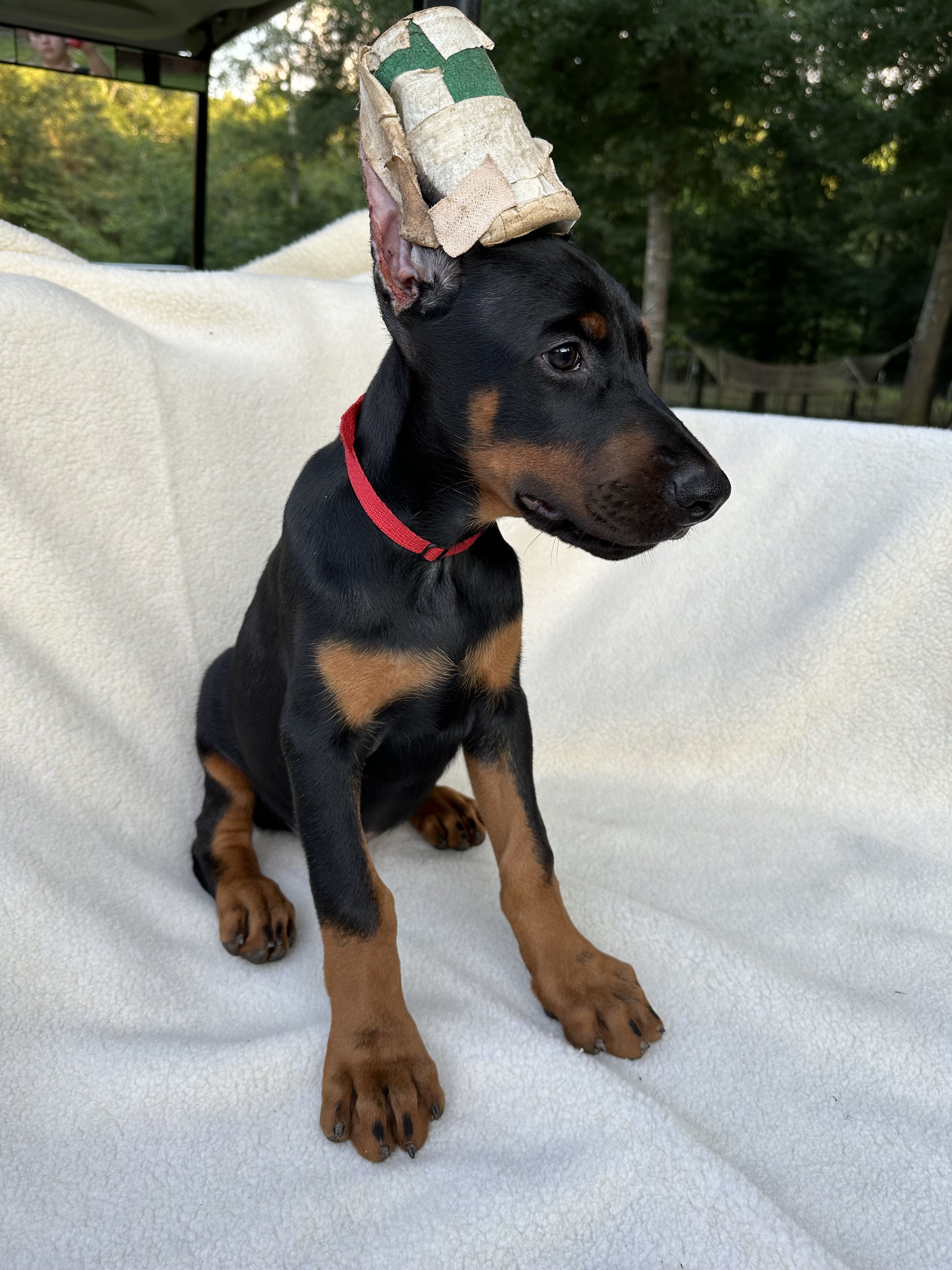 “Price includes: Puppy starter kit, scent toy, collar & leash, AKC application, Medium ear crop, micro chip & tag, dew claws removed & tail dock, vaccination record & sales agreement/contract. Deposits are non - refundable, pups are chosen in the order of the deposits placed.”