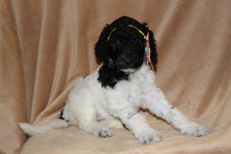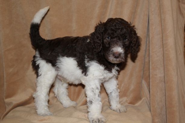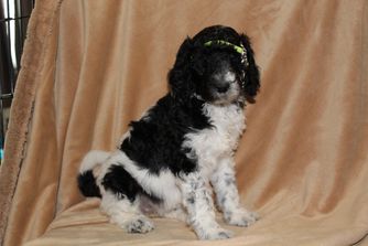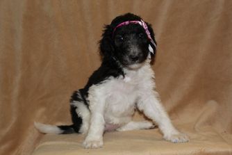 Our Poodle puppies include black, cafe au lait, white, and parti. Aussiedoodle puppies include brown and white, black and white, and black tri-color. Colors will vary depending on the parent dogs.