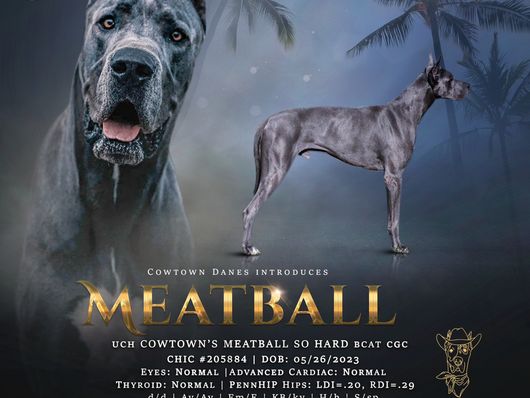 Fully OFA health tested and titled, Meatball is such a fun and good dog! He is medium drive and loves sports. He is out of my female Kailua, who is also fully health tested and titled, and his sire is also health tested and another sporty Dane. Our desire with Meatball’s litter was drivier Danes with a good off switch that are still structurally sound - as shown by Meatball competing in the conformation world as well.