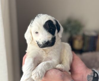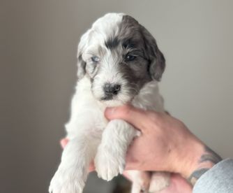 Our Bernedoodle puppies include black and white and merle. Goldendoodle puppies include cream, apricot, and red. Colors will vary depending on the parent dogs.