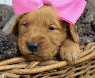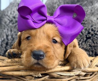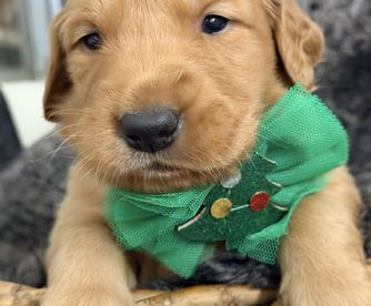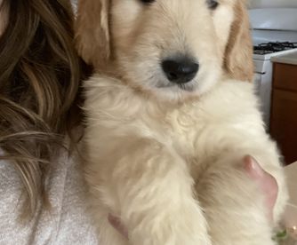 Our Goldendoodle puppies include cream, apricot, and chocolate. Golden Retriever puppies include golden and light golden. Colors will vary depending on the parent dogs.