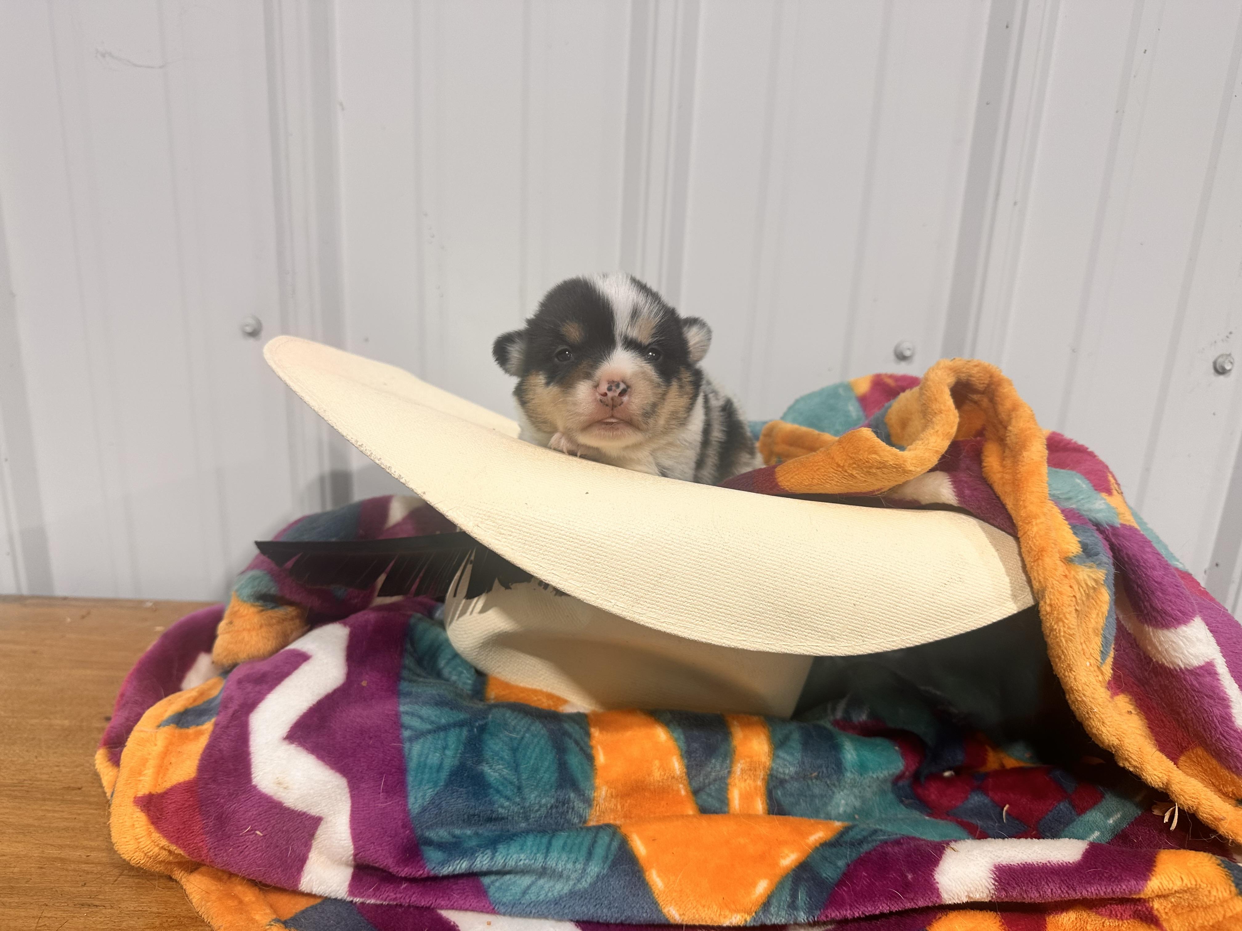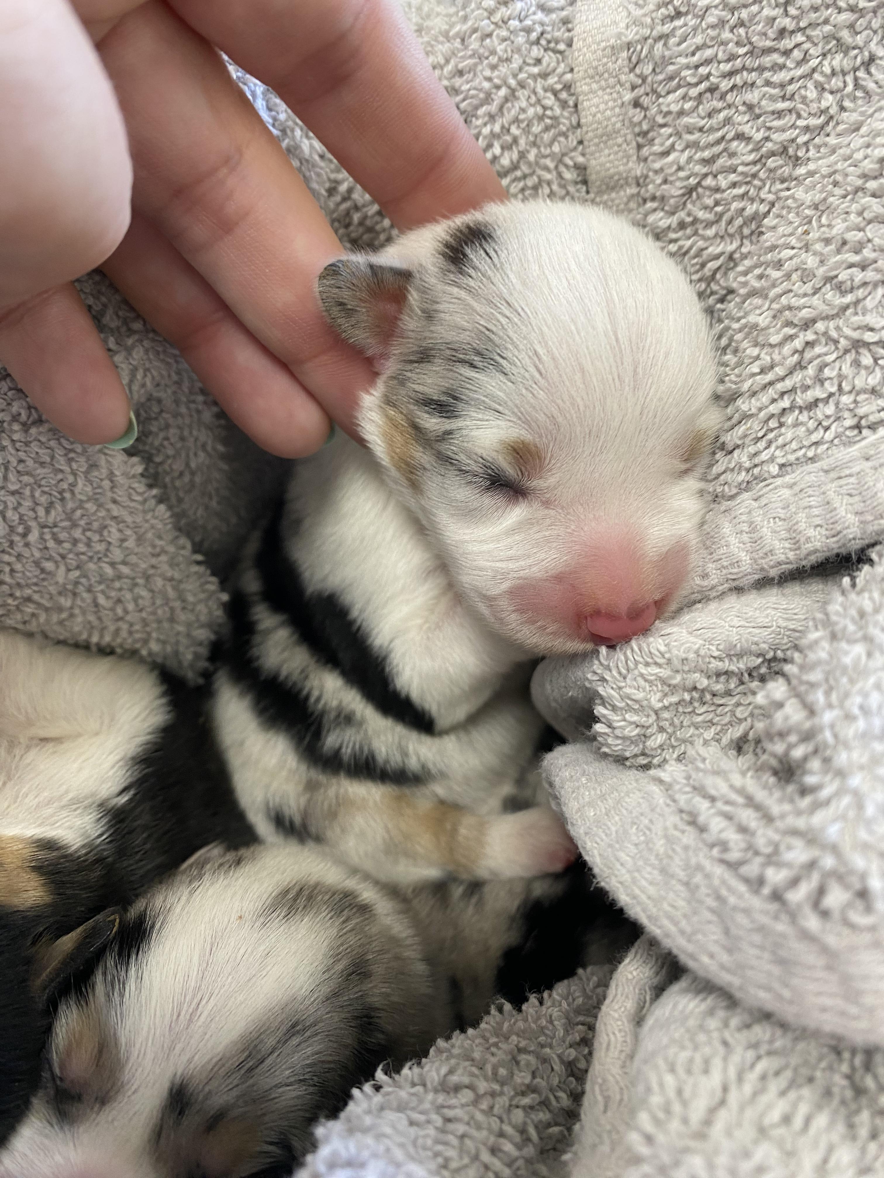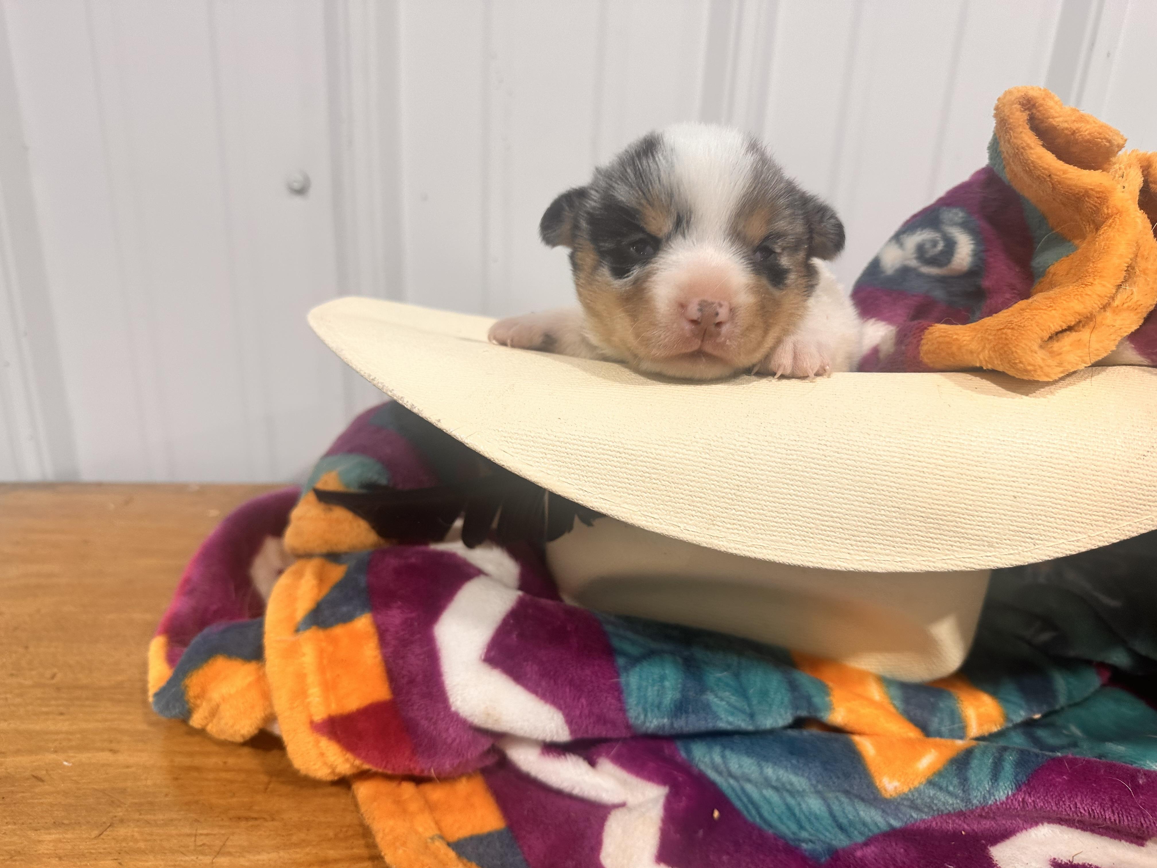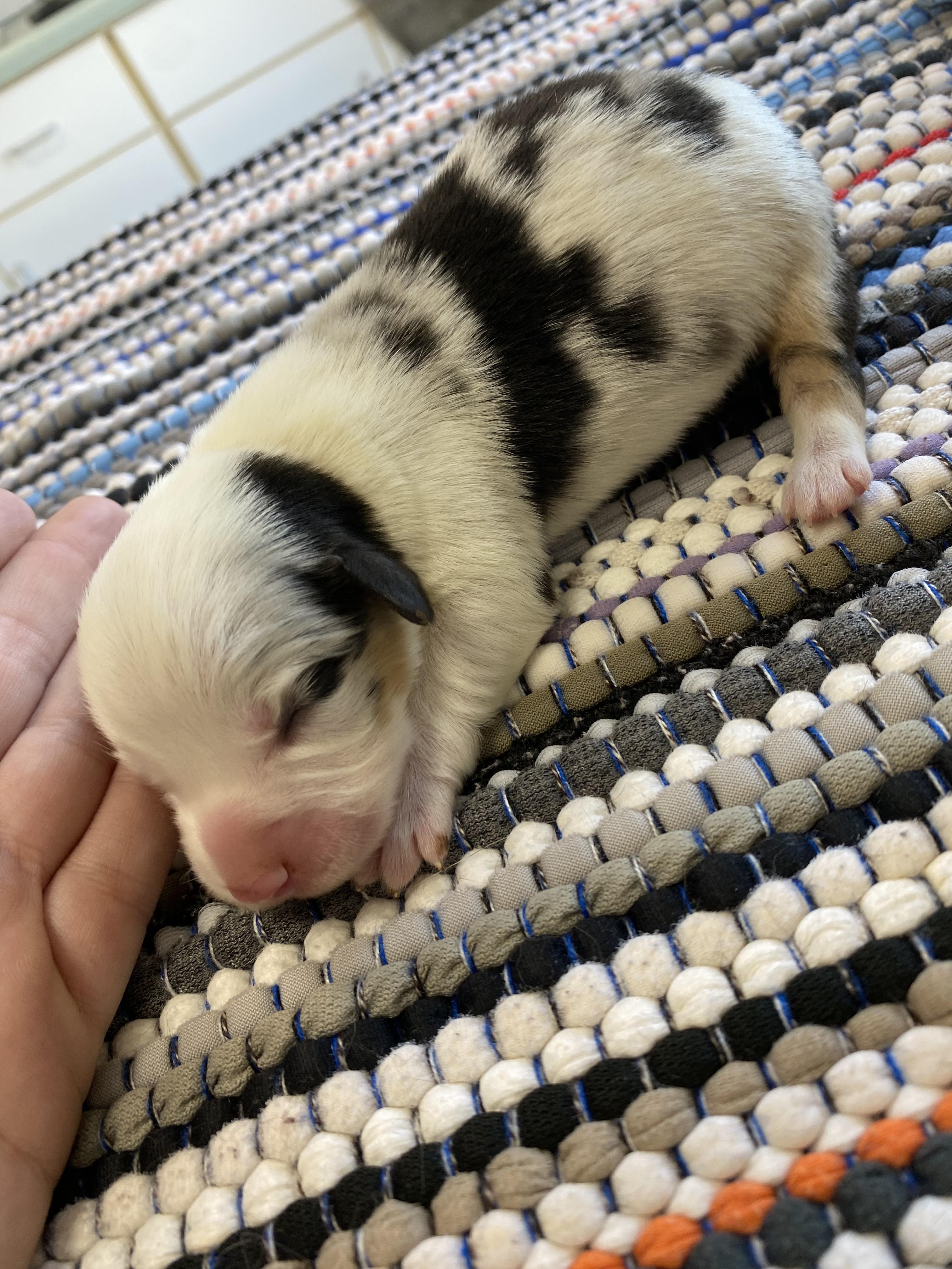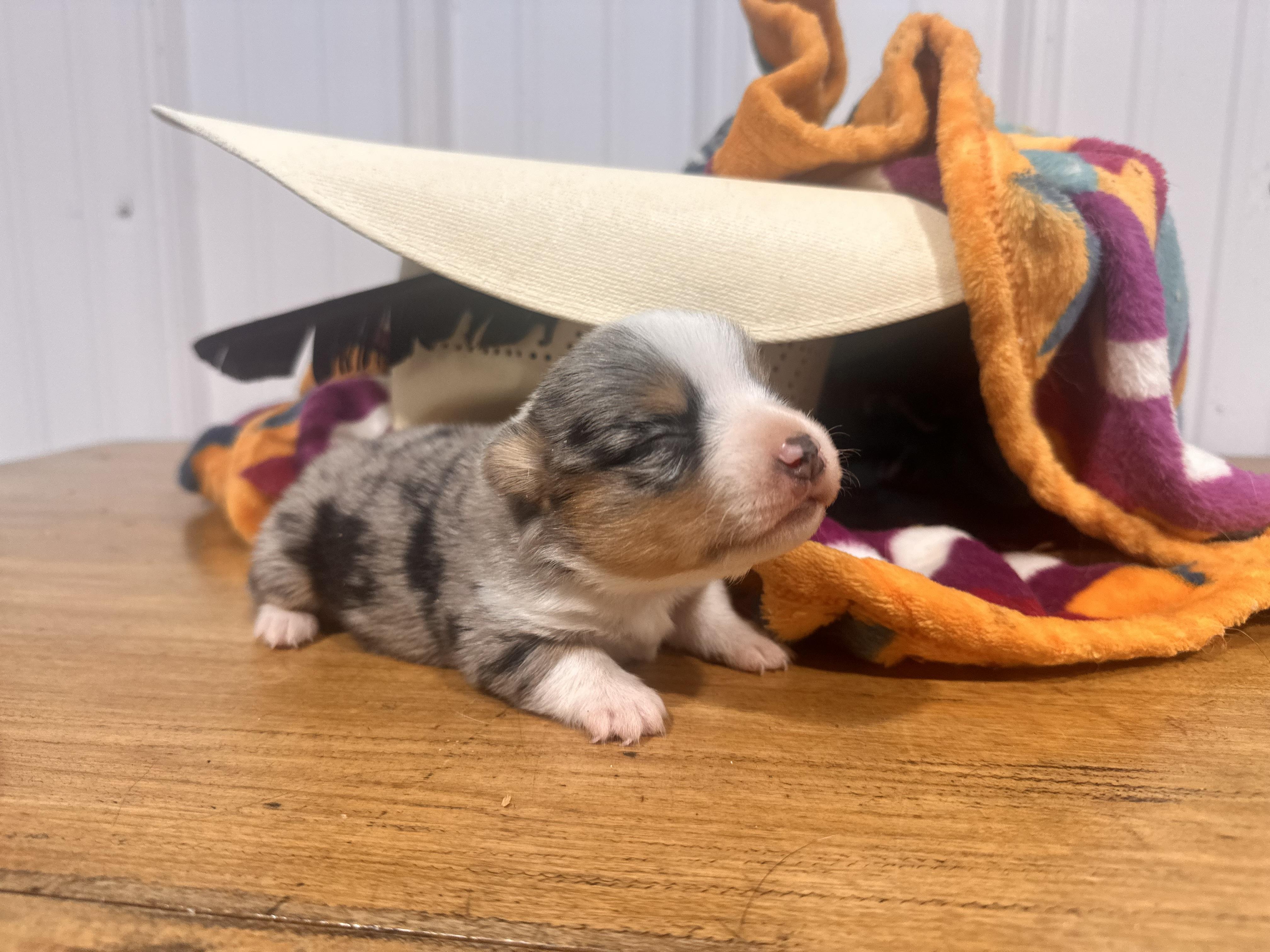 Mae is the sweetest girl and has been the BEST first-time mama! She is full AKC Pembroke, triple clear (good genetics), a bluie/fluff carrier, and just a good mix of athletic and playful.