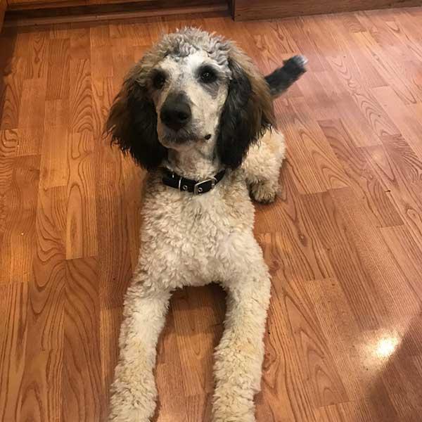 Dobby is our sable particolor poodle stud. He weighs around 55 pounds and has a calm, gentle demeanor. Dobby is clear for genetic diease and received a score of Good on his OFA hip xrays. He's a favorite here at Creekside and with other breeders for his great personality and the wide variety of color traits he carries.
