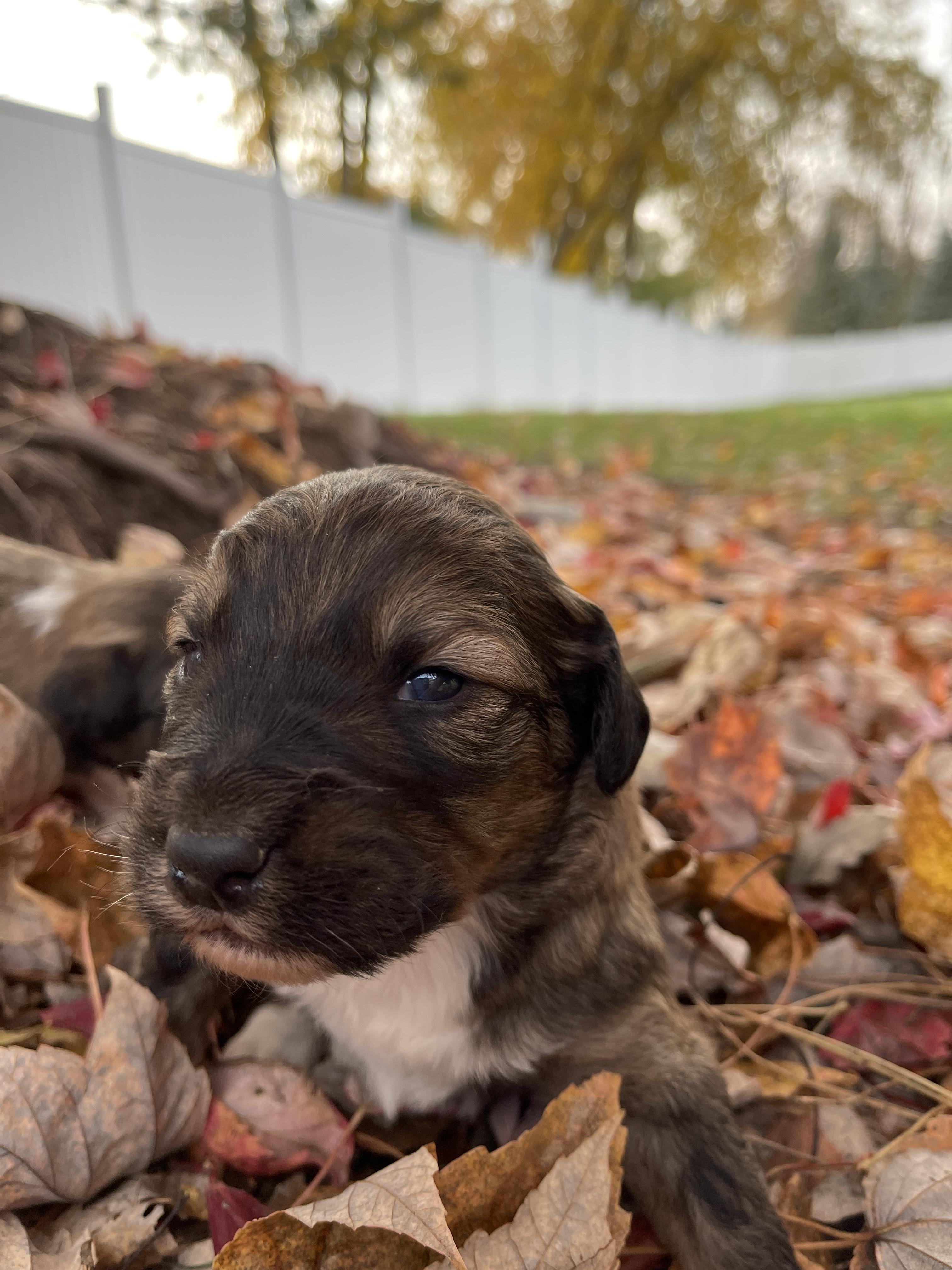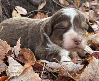 Our Aussiedoodle puppies include red merle, black and white, and black tri-color. Colors will vary depending on the parent dogs.