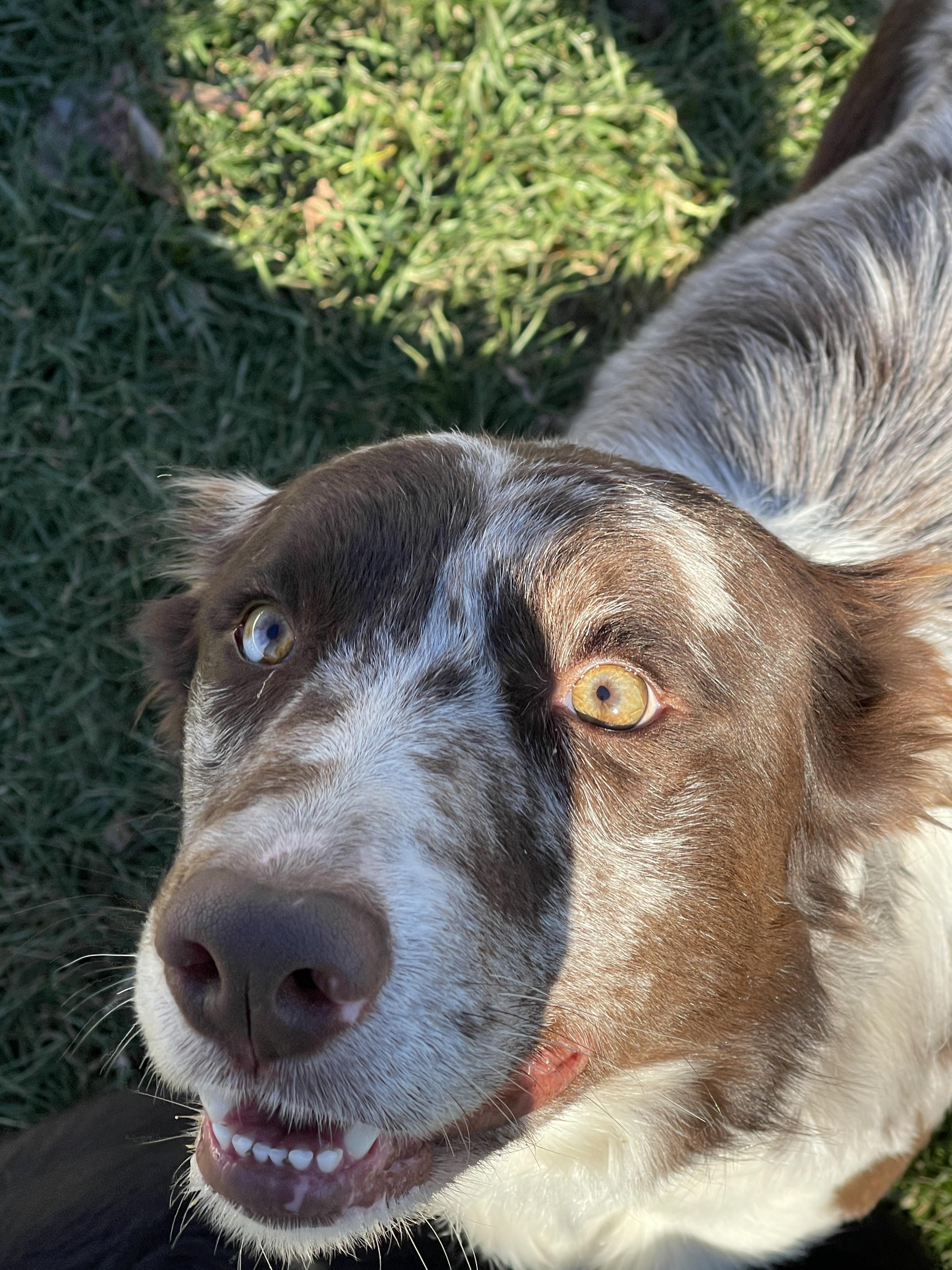 Maggie is a chocolate merle border collie from herding lines. She was born on a cattle ranch in Texas but didn't quite make the cut as a herding dog.. she's too laid back. She is a sweet, gentle girl who is eager to please and is a wonderful mama.