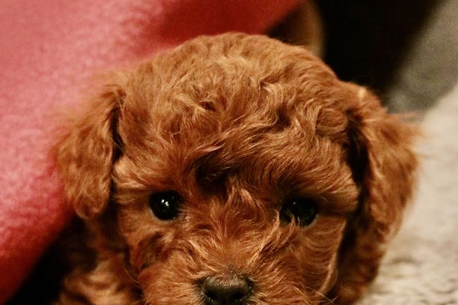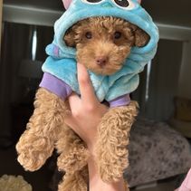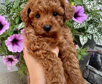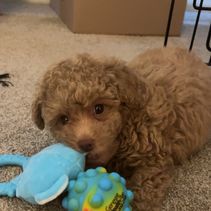 Our happy go lucky girl who loves everyone! Ruby is an AKC Red Toy Poodle. She is vet checked clear and cleared on her toy poodle panel from Paw Print Genetics. Ruby weighs 8.4lbs. Some of her puppies have gone to show homes and done very well in the show ring.