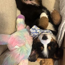 Lincoln is the type of Bernese everyone dreams of. He is a beautiful example of the breed standard with the greatest personality you could ever imagine. He is great with kids, other species of animals and has the best manners through it all.