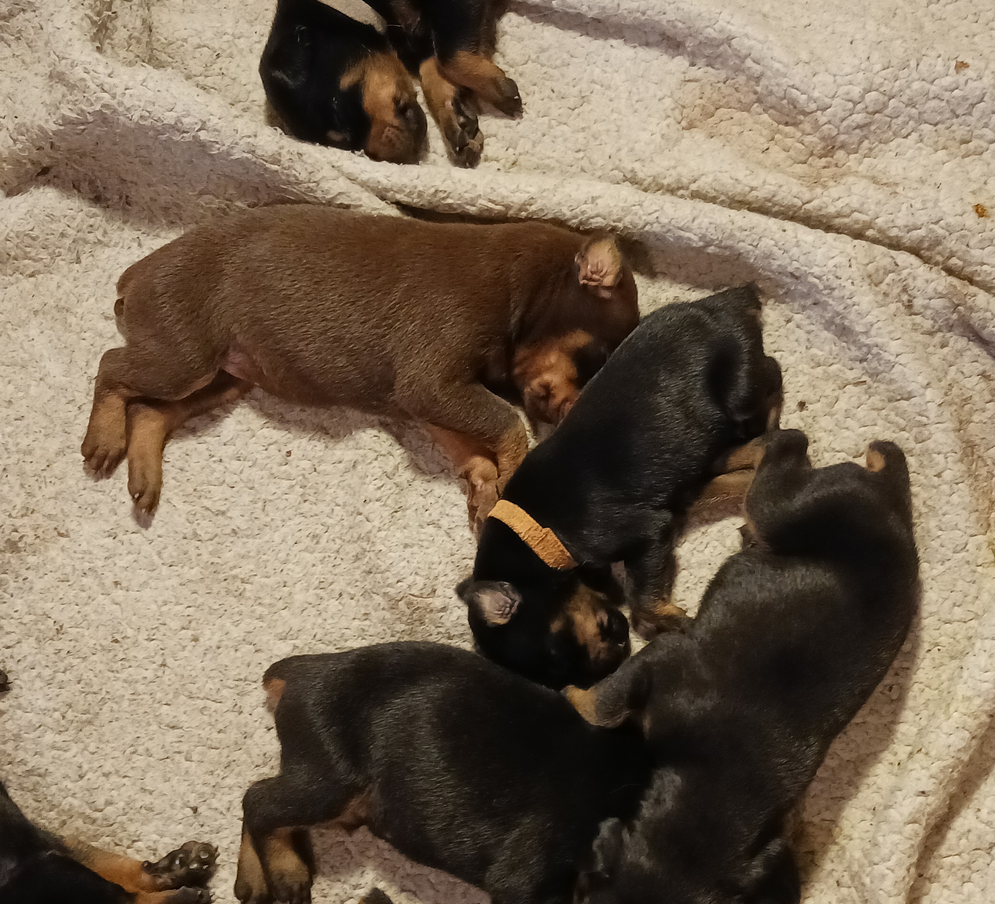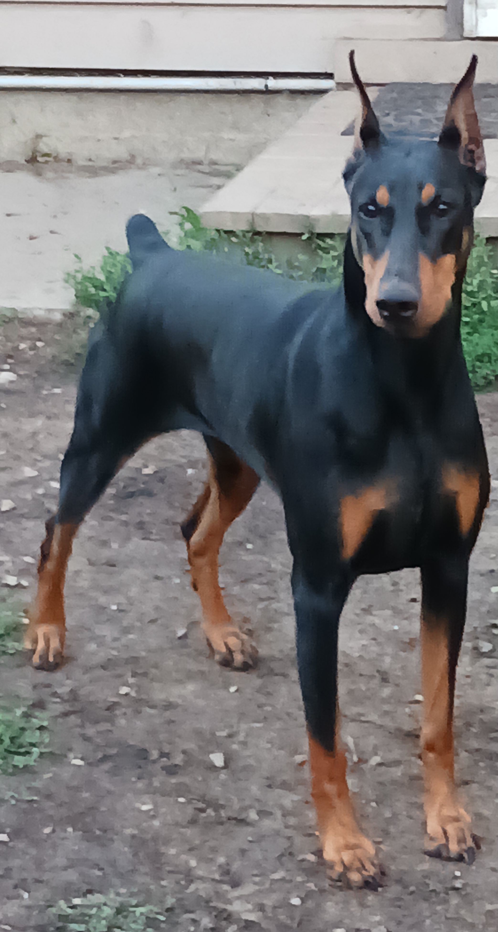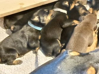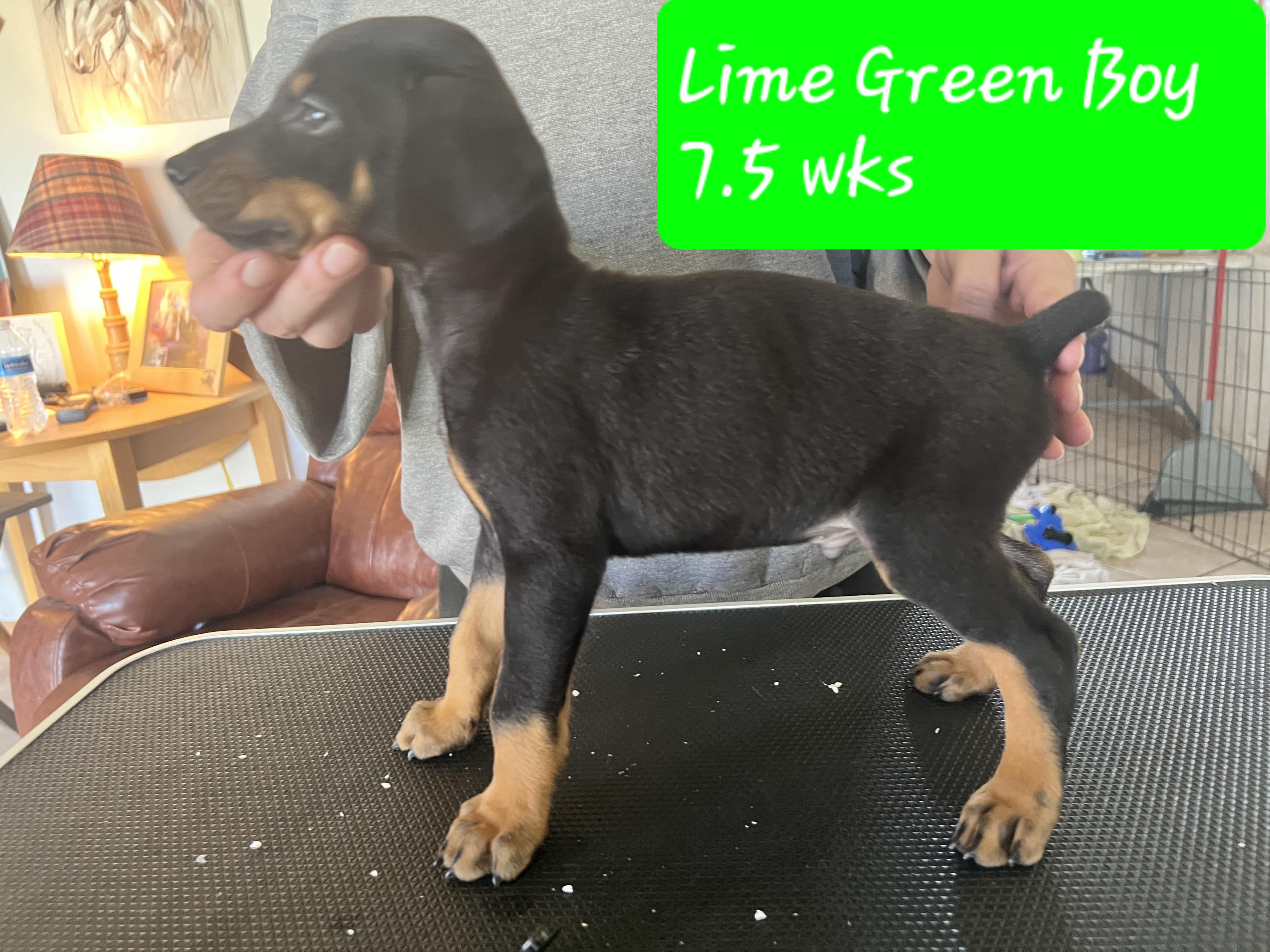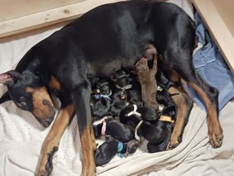 Our Doberman Pinscher puppies include black and rust and red and rust. Colors will vary depending on the parent dogs.