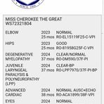 Cardiac Evaluation (registered with OFA), Elbow Dysplasia Finals (OFA, BVA, SV, FCI), +3 more.