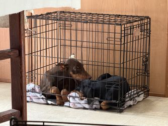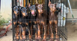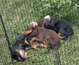 Our Dutch Shepherd puppies include silver brindle and gold brindle. Doberman Pinscher puppies include black and rust and red and rust. Colors will vary depending on the parent dogs.