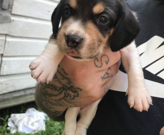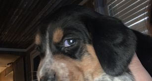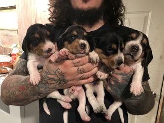 Our puppies include white black and tan, brown white and tan, black tan and bluetick, and black red and white. Colors will vary depending on the parent dogs.