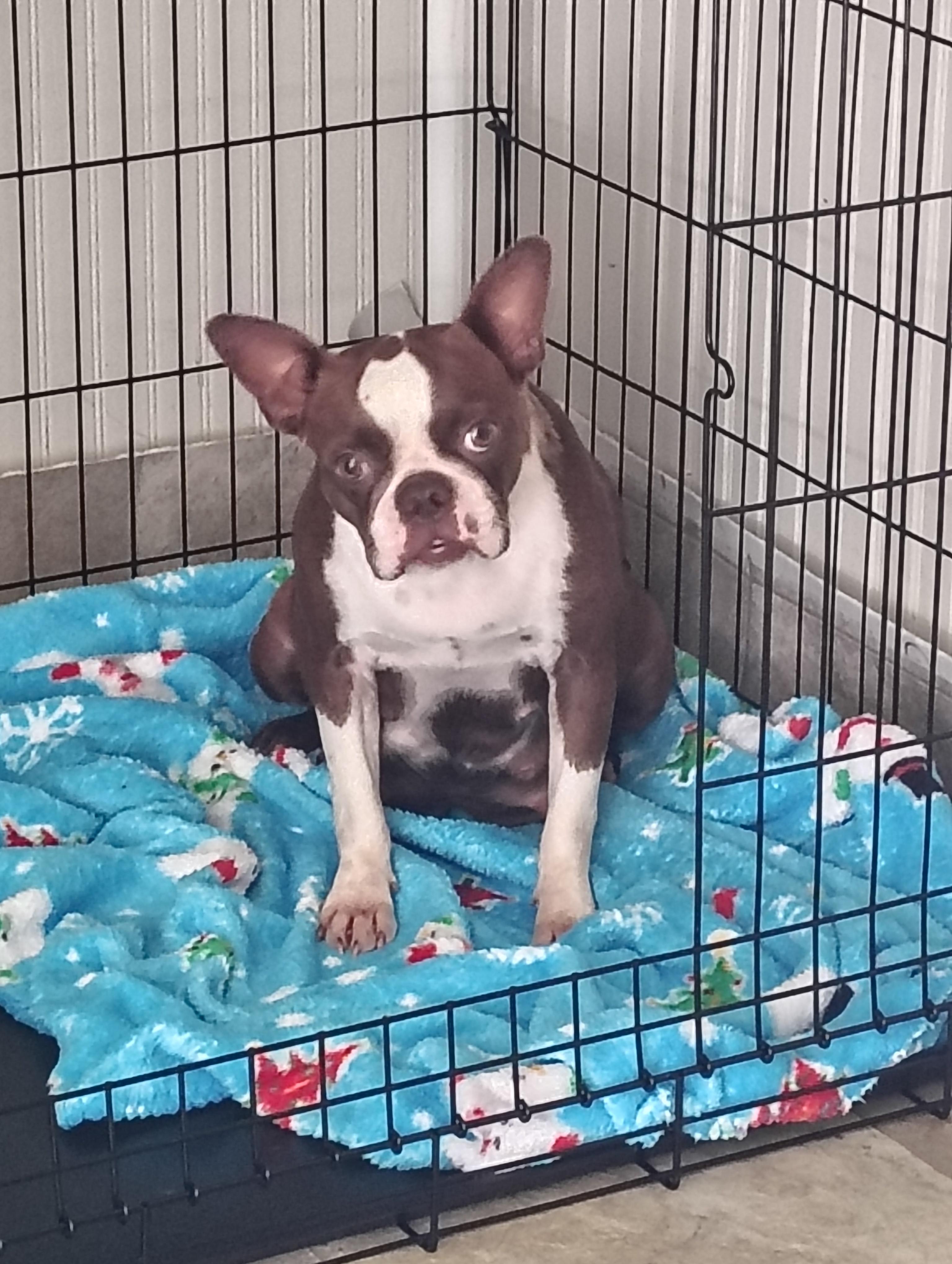Maggie is a female Boston Terrier. Carefully selected as a great representative of her breed, Crystal decided to make her part of their program. Crystal has passed Good Dog’s screening process, which involved a review of their breeding practices, environment, and the mental and physical health of their dogs.