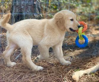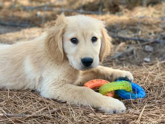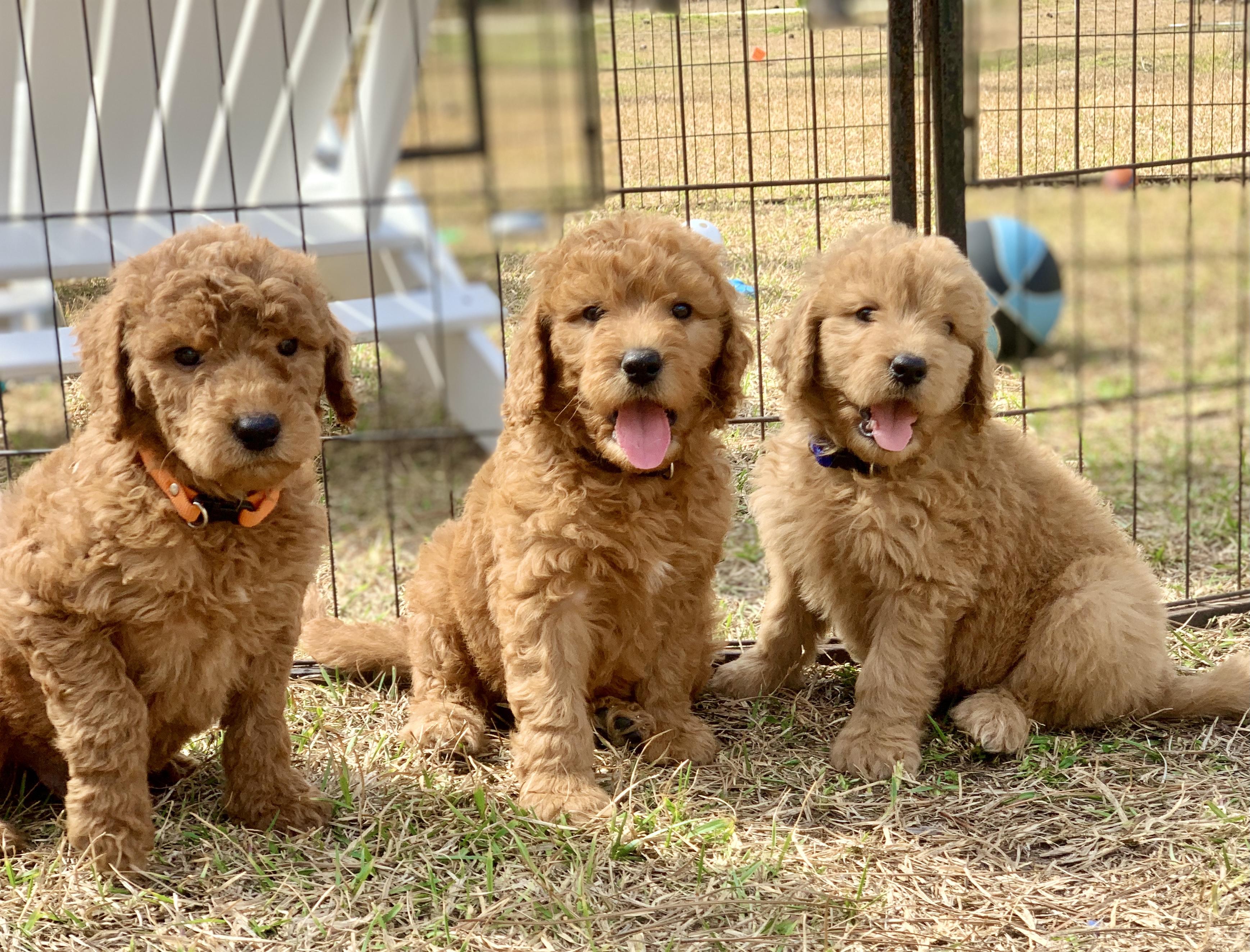 Our Goldendoodle puppies include apricot and red. Golden Retriever puppies are golden. French Bulldog puppies are cream. Colors will vary depending on the parent dogs.