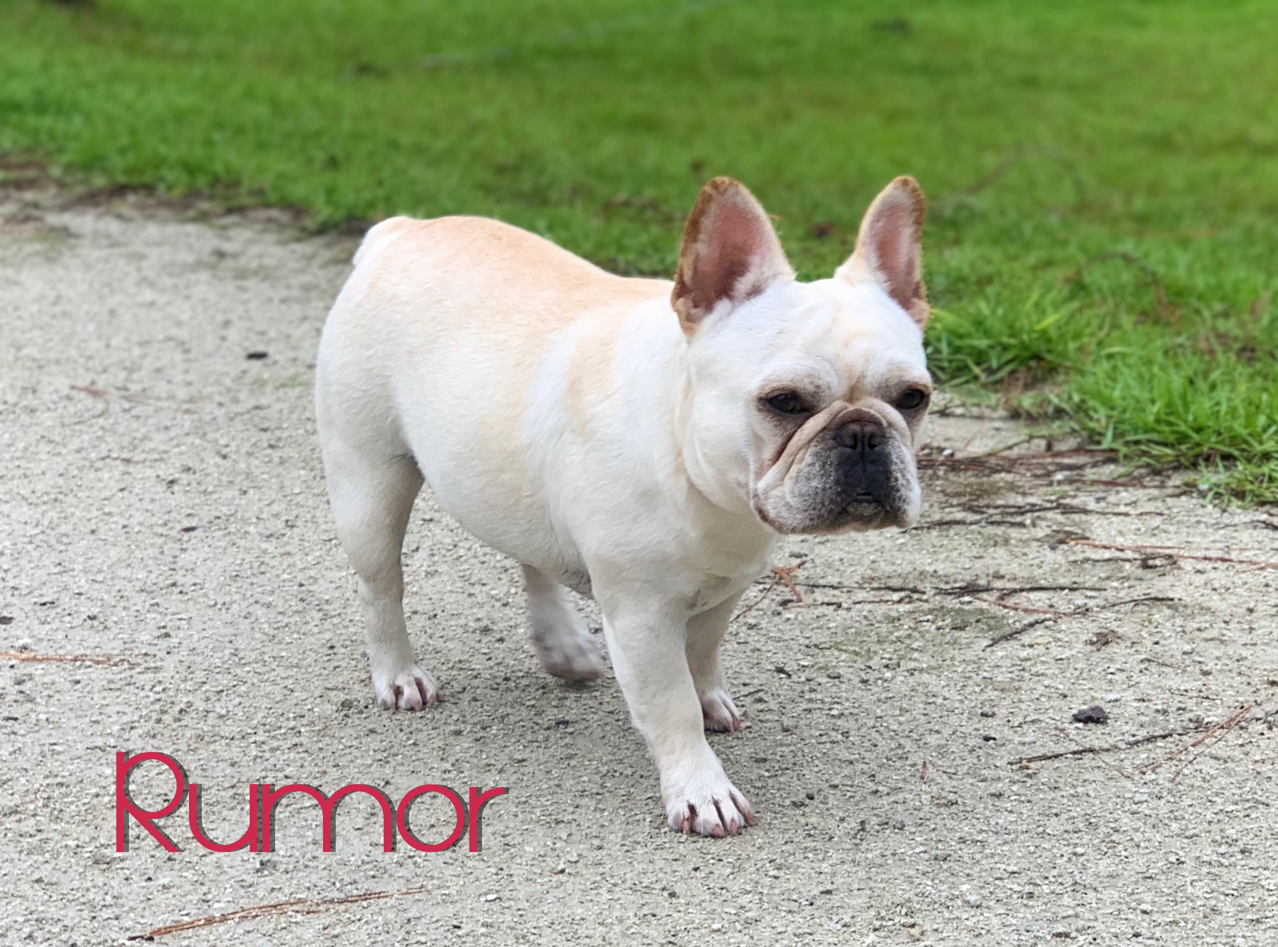 Rumor is a female French Bulldog. Carefully selected as a great representative of her breed, Kathrine decided to make her part of their program. Kathrine has passed Good Dog’s screening process, which involved a review of their breeding practices, environment, and the mental and physical health of their dogs.