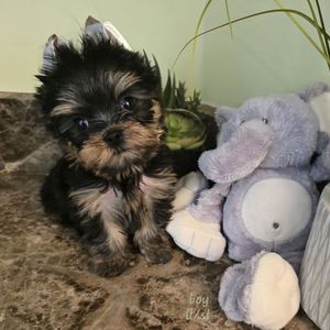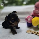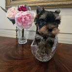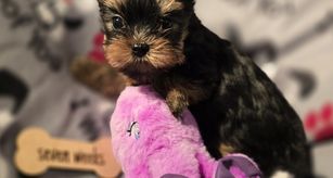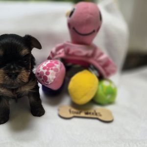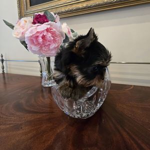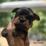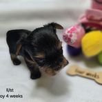 Lalique is AKC registered Blue & Gold yorkie. She comes from champion lines and has a beautiful long black silky coat. She is very petite and hovers at 4 lbs.
