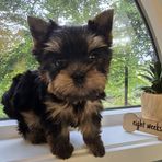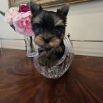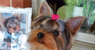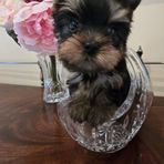 Waterford is a CKC registered chocolate yorkie. He is very, very smart and received his Canine Good Citizen, Trick Dog and Therapy Dog Certification at 17 months old. He is currently testing for his Service Dog cerification. He is very tiny and teeters between 3 3/4 and 4 lbs.