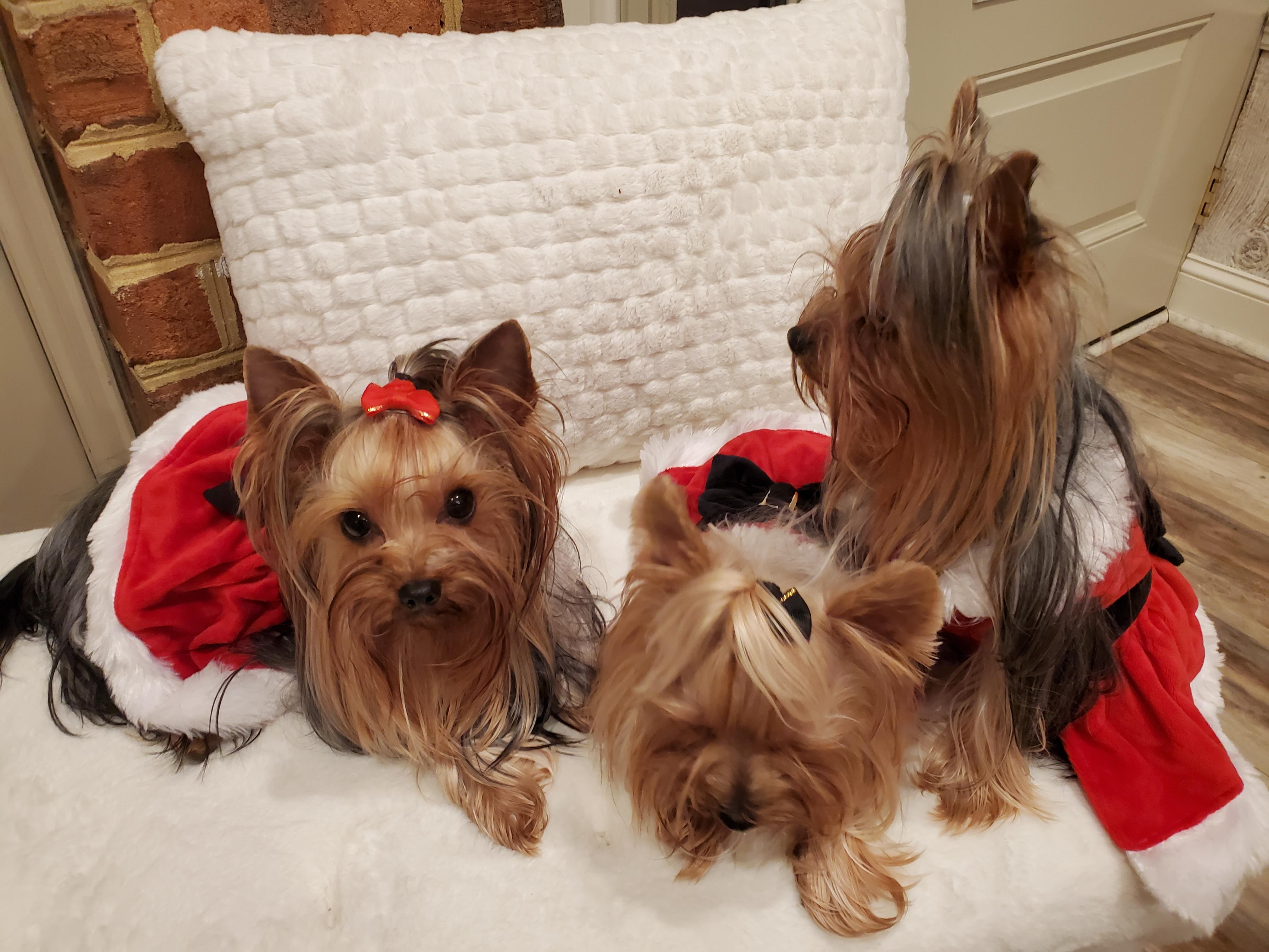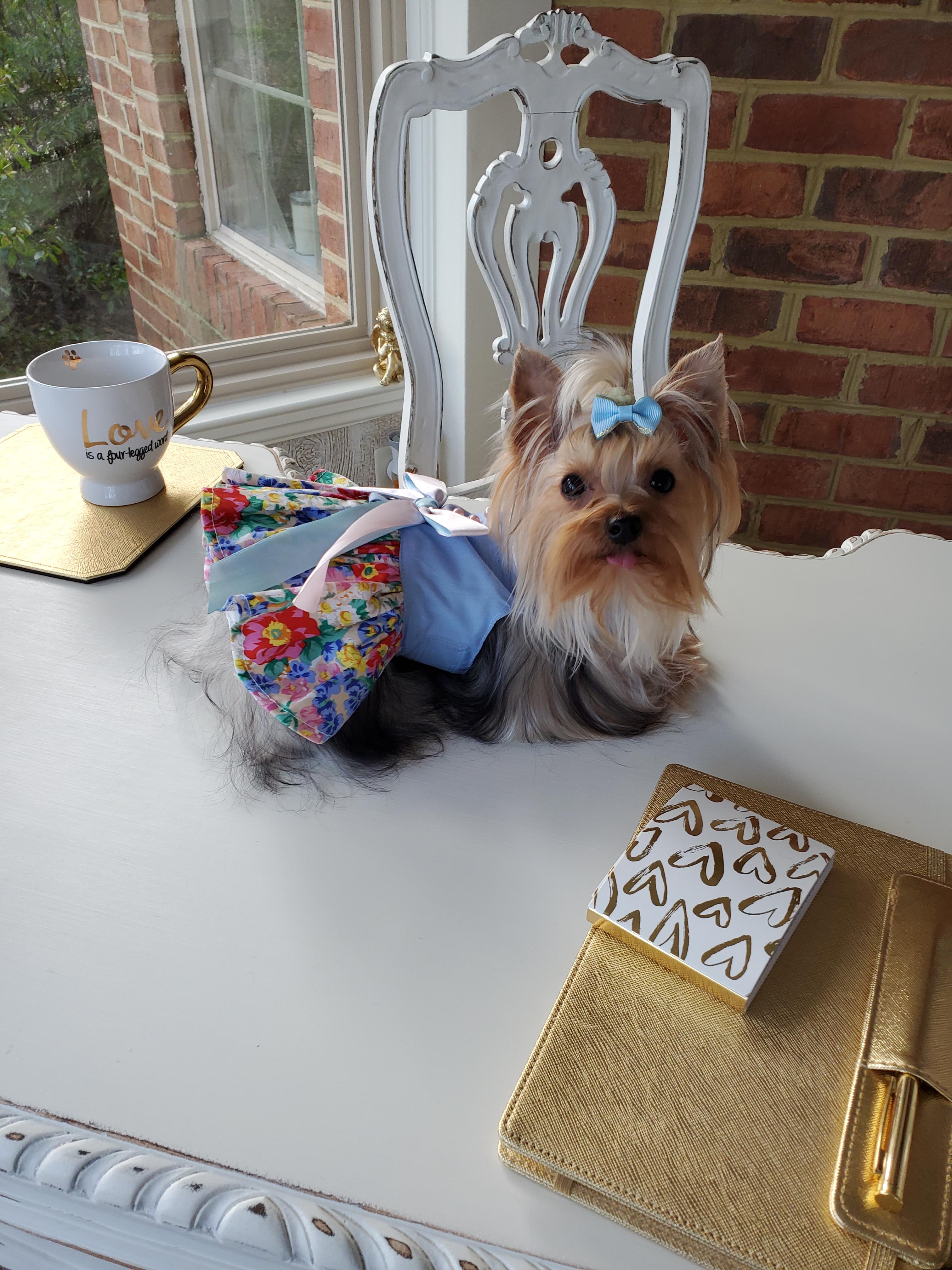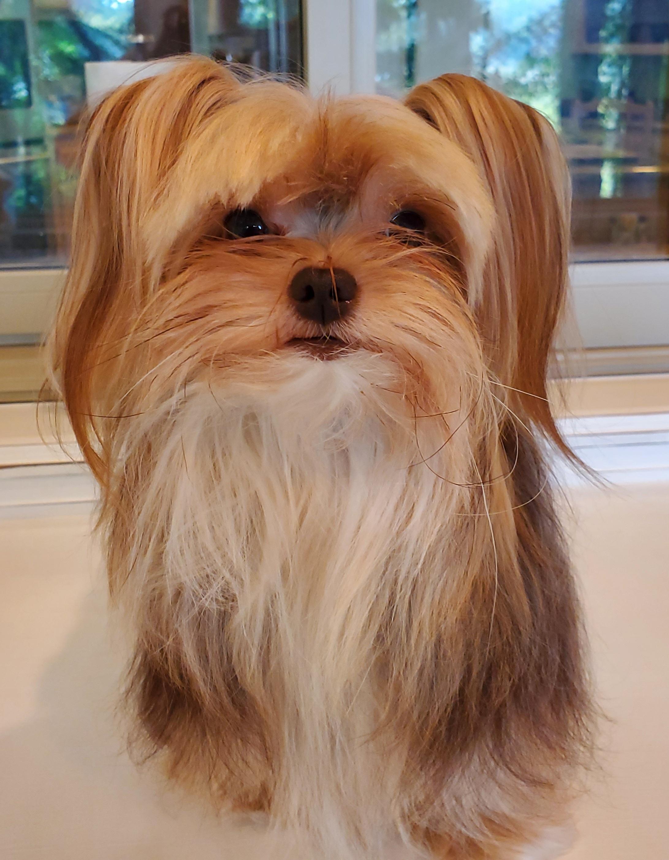 Waterford is a CKC registered chocolate yorkie. He is very, very smart and received his Canine Good Citizen, Trick Dog and Therapy Dog Certification at 17 months old. He is currently testing for his Service Dog cerification. He is very tiny and teeters between 3 3/4 and 4 lbs.