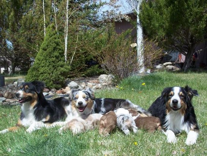 Our first Aussie entered our family in 1980 after witnessing one dog's amazing talent when herding our loose horses off of a busy highway and back into their resident pasture. Originally bought as horseback riding companions Rocket and Levi quickly wormed their way into the family hearts forever. Since that time we have seldom strayed from this intelligent, loyal breed. The breed has intertwined itself within our core family group to encompass 8-10 family members owning in excess of 20 Aussies. This does not include the many puppy buyers that have become longtime family friends. Agility was discovered by Katrina in the year 2000. It was not long before many other members joined in the fun. Today we have 7 members of the family actively training and competing with about 14 dogs. The sport is highly addicting and a lot of fun for both handlers and dogs alike.
