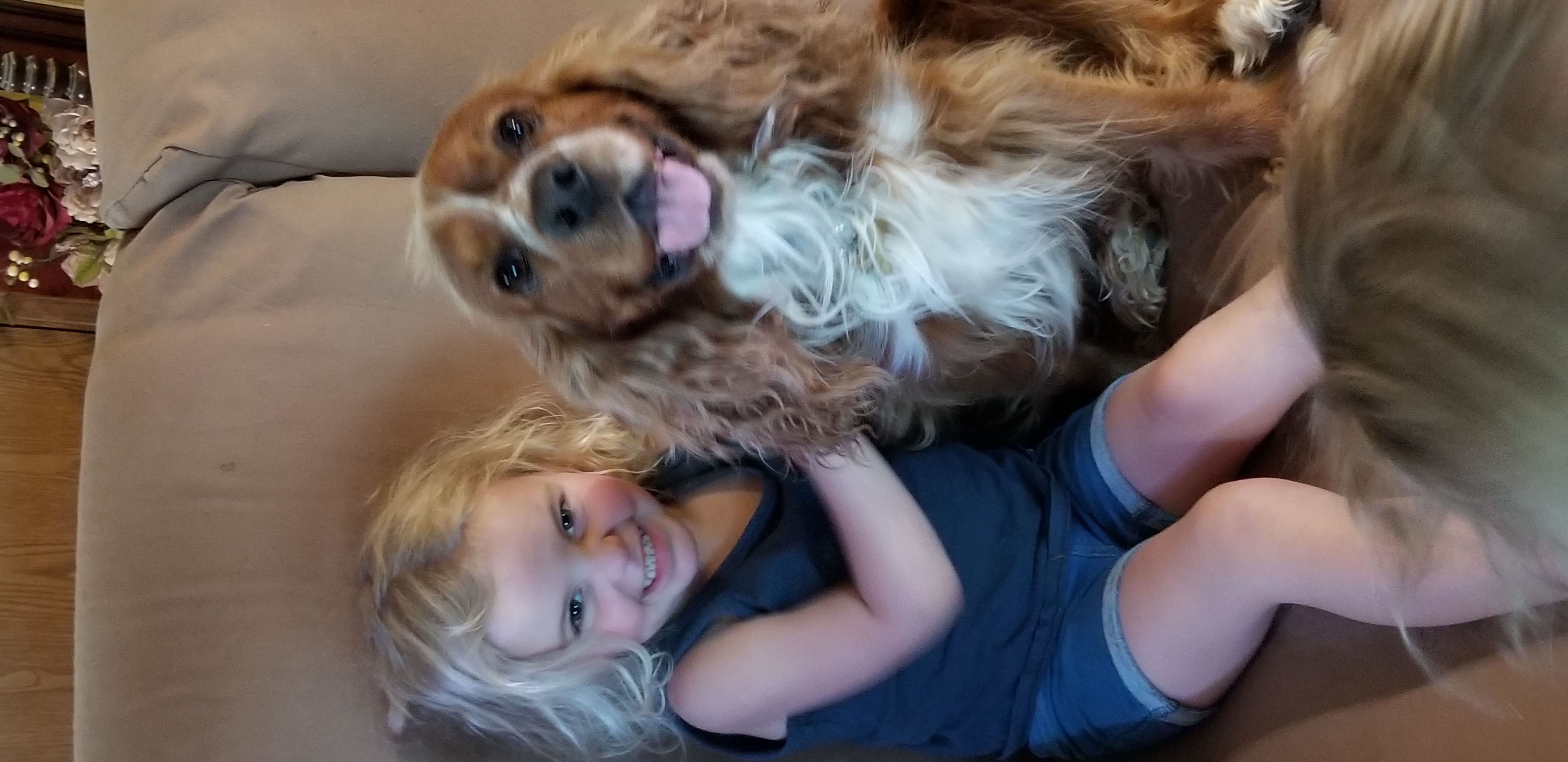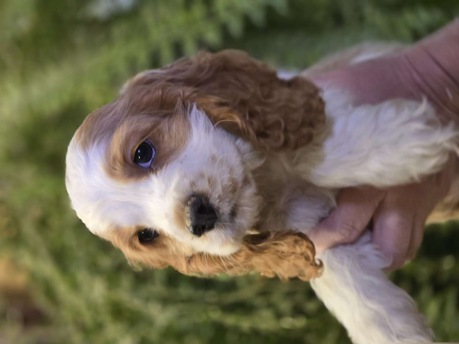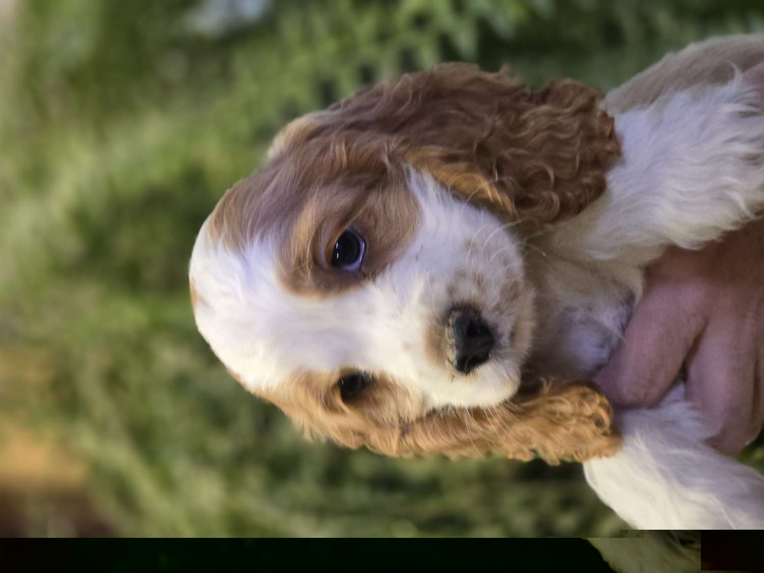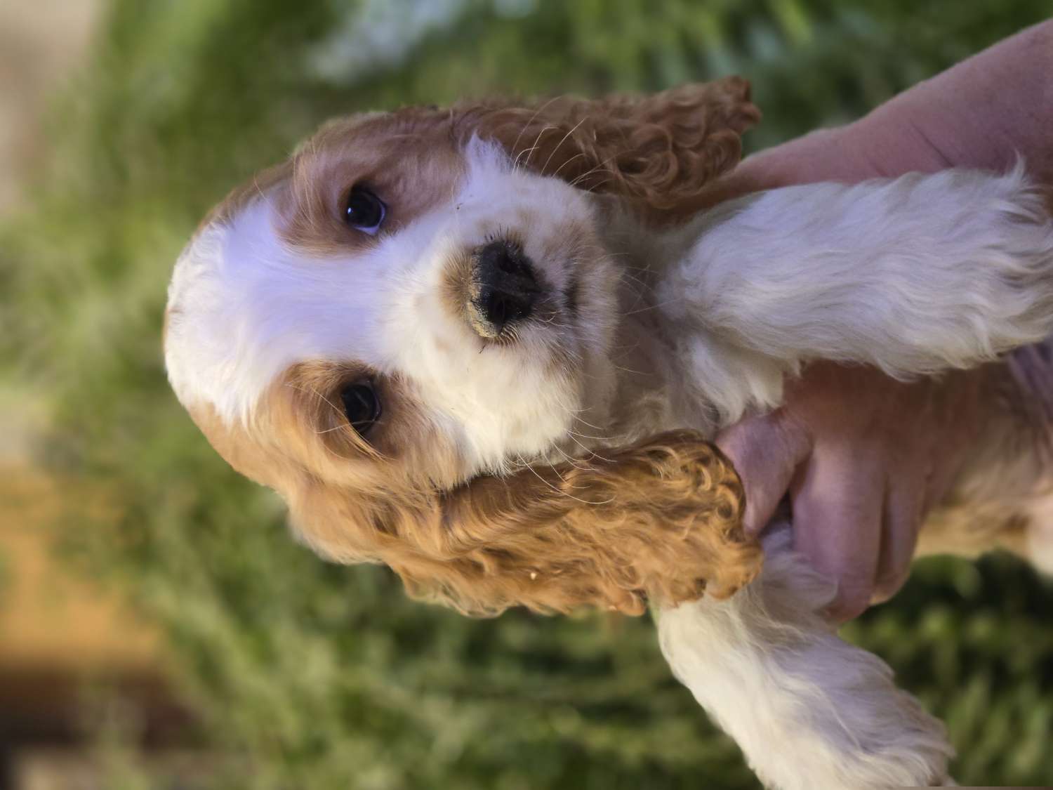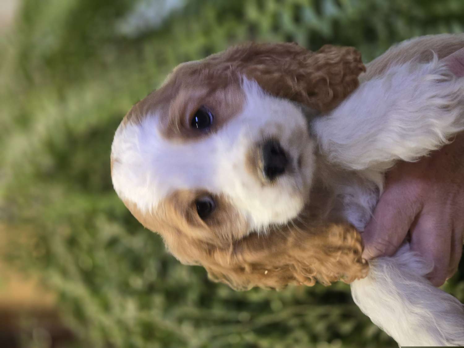 Red and white silky haired, purebred American cocker spaniel from a residential home in Missouri. He has a white blaze into his forehead, freckles on his nose, a white throat, chest and stomach, and white socks. He has a blonde head ombreing into his ears. He has been hand selected to be the Sire of our breeding line due to coloring, temperament, and comical personality. He is, first and foremost, my best friend. Secondly, he is the breeding Sire. He sleeps with me at night and takes center stage in the middle of the bed. He's a goof !!! and is Dearly loved!