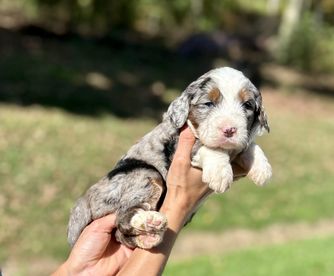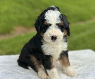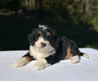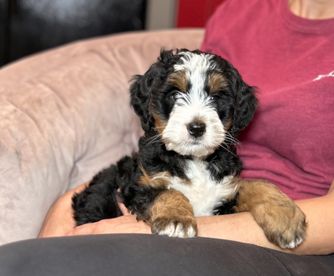 “The price included a 1 year genetic guarantee, they are up to date on all shots and dewormers and microchipped. Are well socialized and started on leash training and crate training. Our tri colored mini Bernedoodle pups are 2500. If any are Blue Merle with blue eyes they are 3000. Our F1b micro Bernedoodles are 3000.”