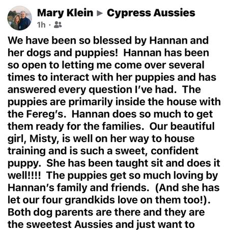 We had been searching for quite some time for a puppy for our home. Once we saw the Cypress Aussies listing, we immediately requested more information. Hanan was responsive from the very beginning and we were able to meet the puppies prior to making any commitments. All the puppies were so sweet and cuddly. We are beyond excited to have the newest addition to our family.