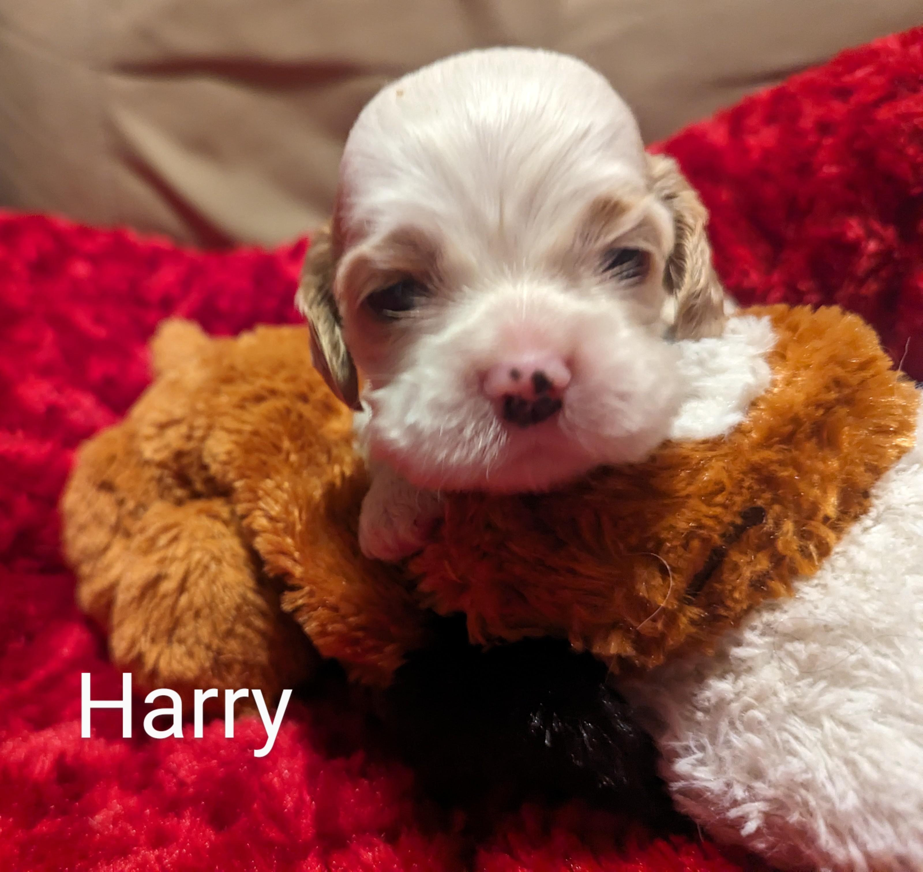 Our puppies include red and white and black and white. Colors will vary depending on the parent dogs.