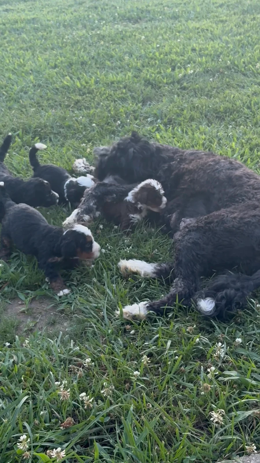 Oakley is a superb Mini F1b Blue Merle Bernedoodle. She is what is called a Unicorn which simply means she is clear on all DNA Health Genetic Variants. So her babies are super healthy. And she’s a wonderful momma. She always produces puppies with beautiful colors and great temperaments. We have both of her parents here on the farm as well.