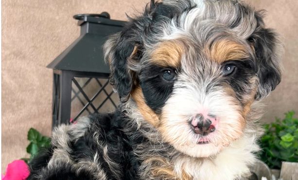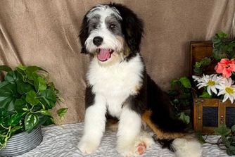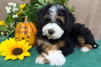 Our Bernedoodle puppies include brown and white, tri-color, and blue merle. Colors will vary depending on the parent dogs.