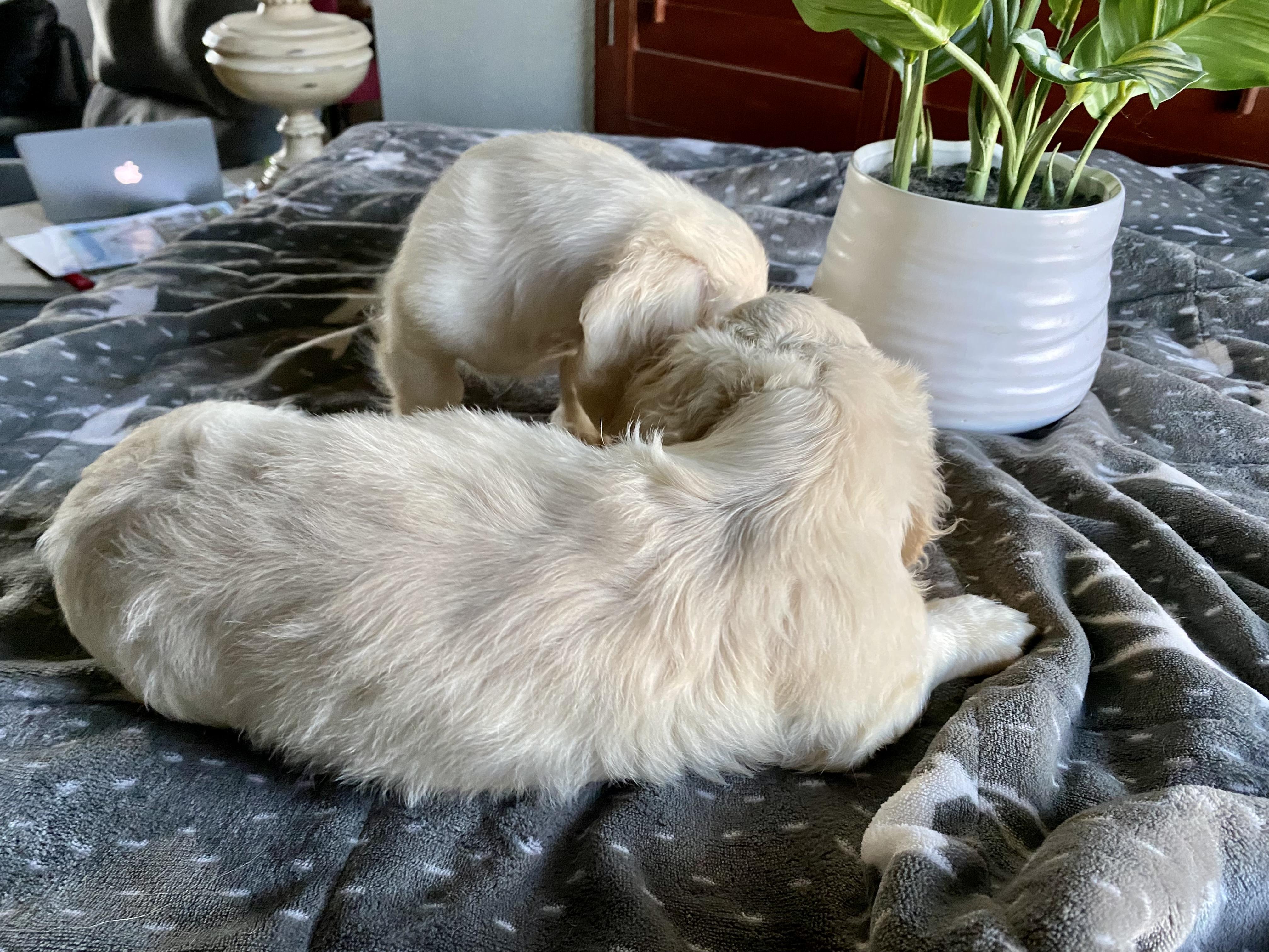 Our puppies include cream, red, fawn (isabella) and cream, wild boar and cream, chocolate and tan, black and cream, blue and cream, chocolate and cream, and dapple. Colors will vary depending on the parent dogs.