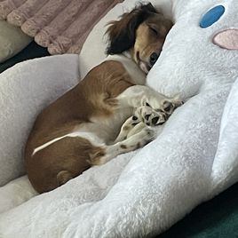 Strudel is a very sweet and affectionate dog. She enjoys the water, but walks aren't really her thing. She's a low rider and prefers swimming. Strudel loves to be held like a baby and have her tummy rubbed. She is a wonderful family dog who loves my family; I'm thrilled to be able to place her babies with other families.