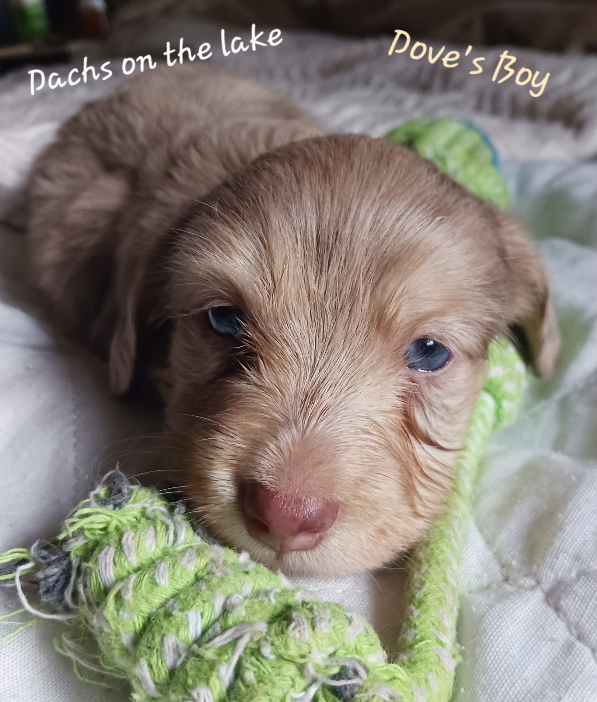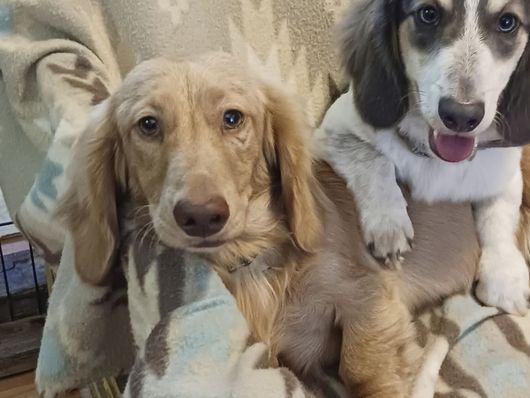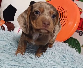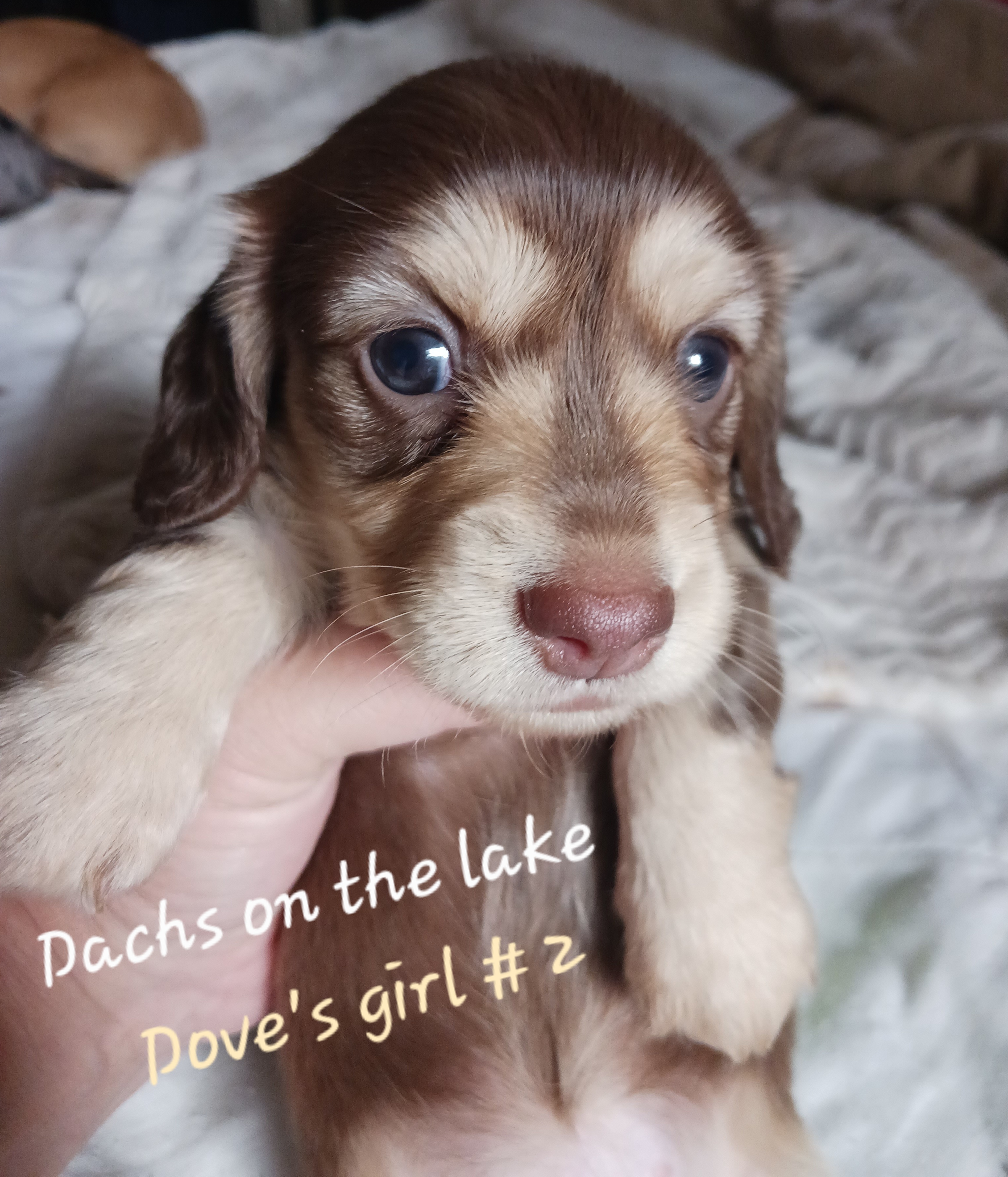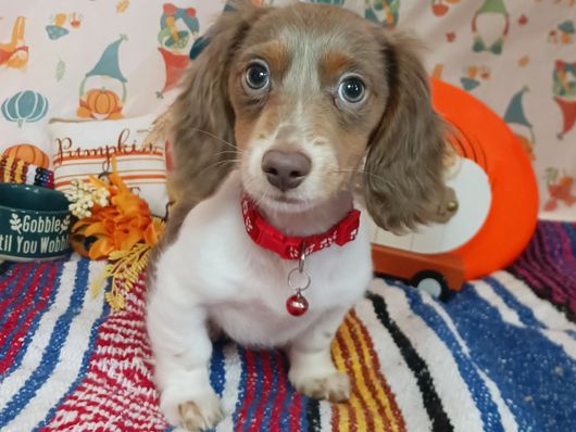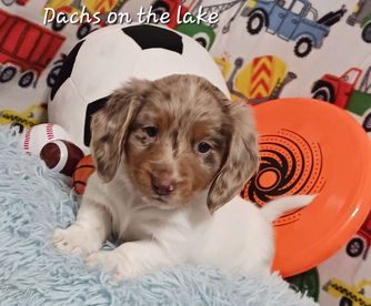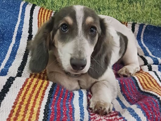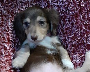 Huck is our 2nd up and coming stud for Gen B. He lives with us but is co-owned with Red Dirt Dachshunds and has it all! He's a long haired, blue cream piebald, PRA clear. He is the sweetest dude and just wants his belly rubbed all the time!