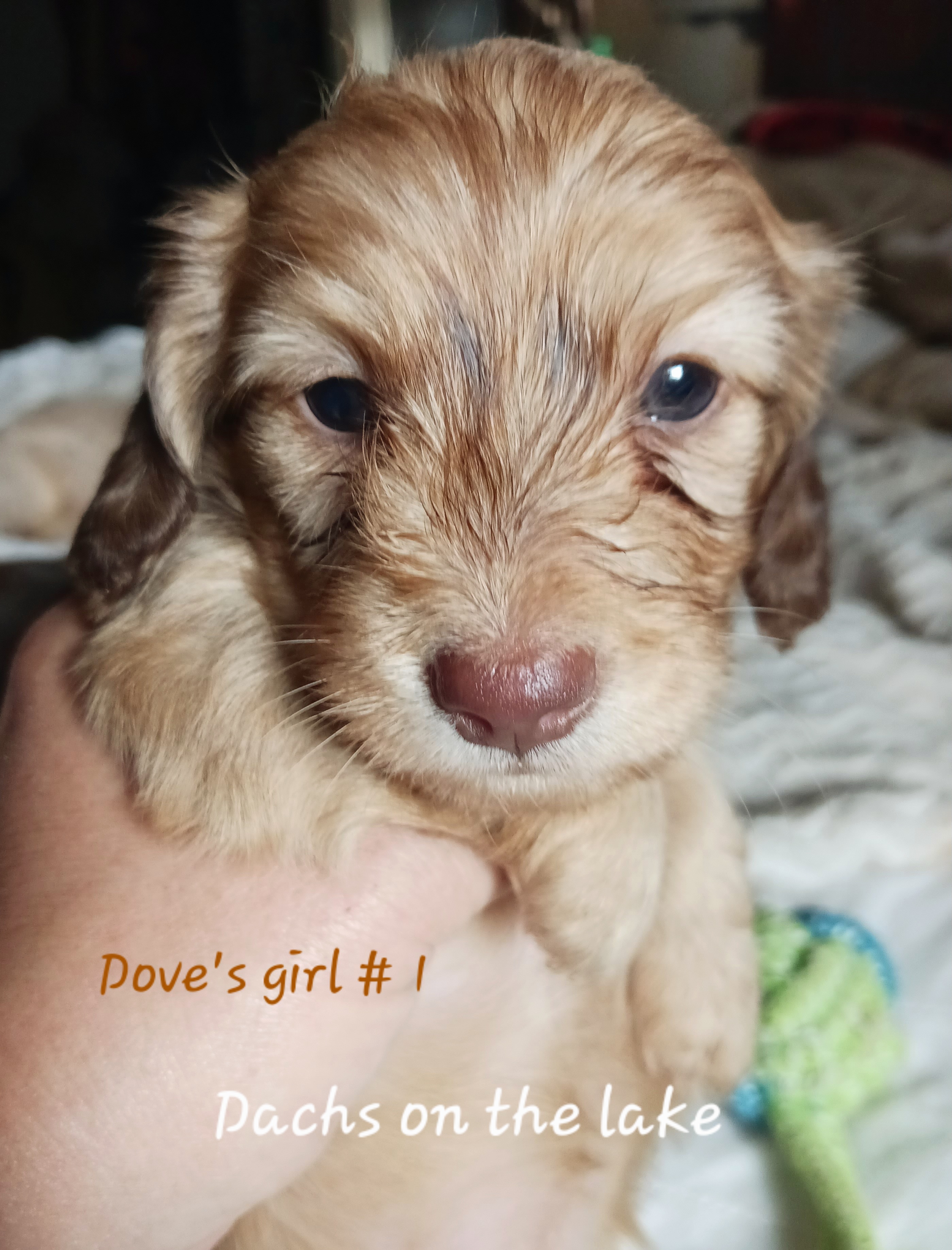 Smudge is our tiny, 7 lb chocolate, smooth coat. She is the grand daughter of Maggie and Marlee, and daughter of Dobby. She's loves to kiss and give all her affection to whoever will let her! We can't wait to find out if she carries cream and dilute from her sire. She may carry for long hair too.