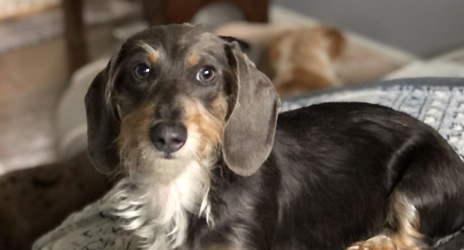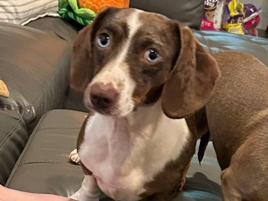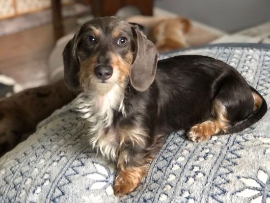 Stella is a gentle girl who is thick! This beautiful girl is chocolate dapple pie with the shortest fattest dachshund paws that we love so much! Stella loves to stomp her way in for snuggles plowing anything that’s in her way! She’s always such a happy goofy girl! She sits so pretty for a “cookie!”