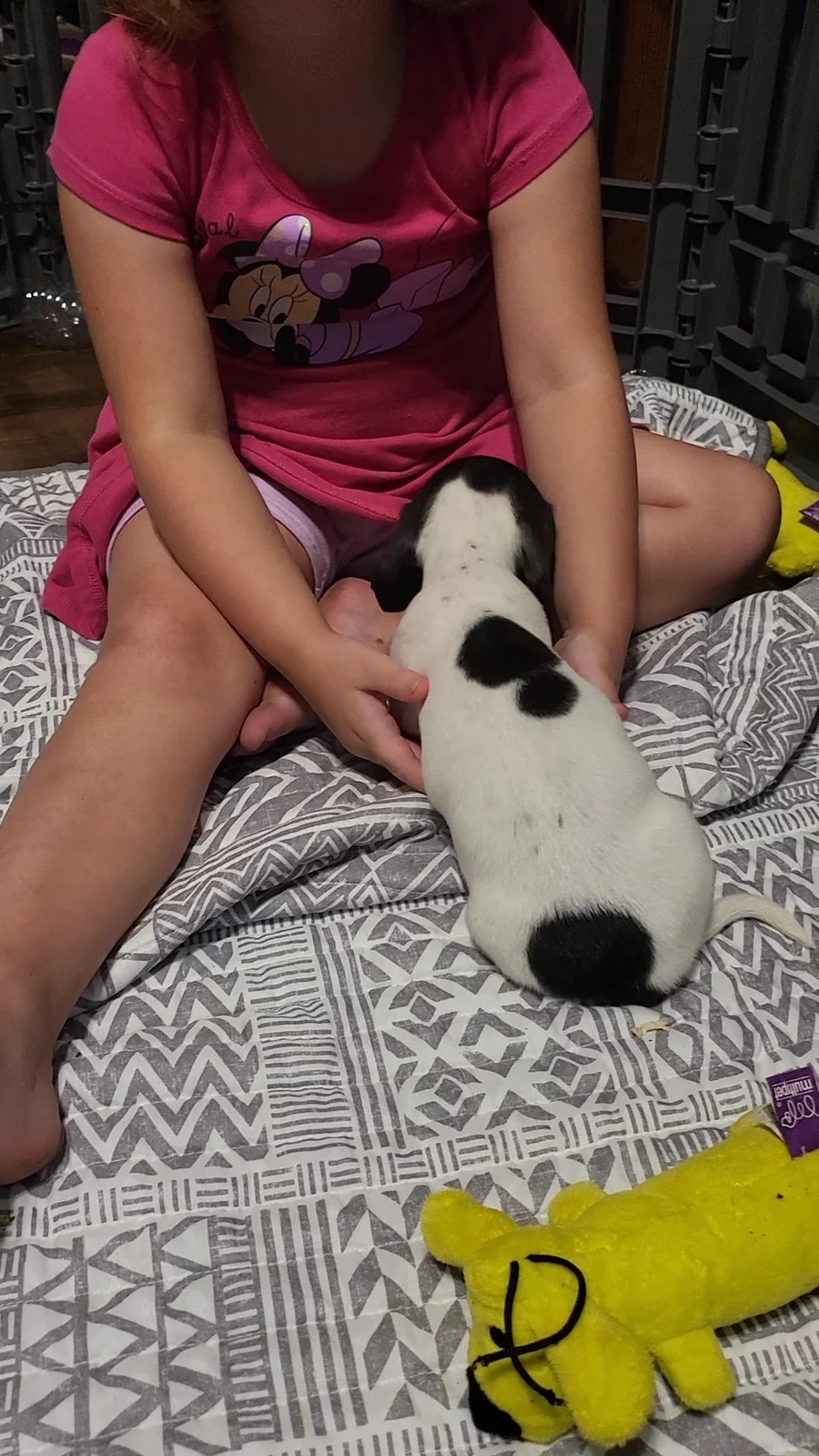 When we first got Winky, she curled up on my daughter's neck and stayed there the whole way home! Once we got home and she got used to us, she came right out of her shell. She is mischievous, energetic, and a terror to our other dog! We love watching her chase him around and walk on his back while he grumbles at her!
