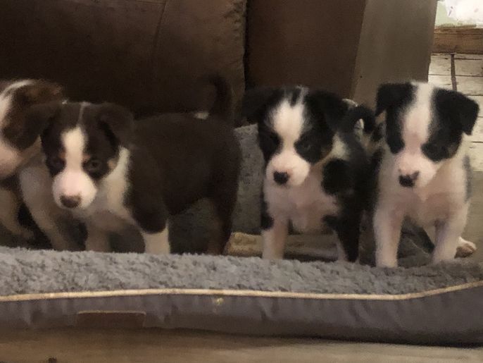 Our Border Collie puppies include tri-color and white and red. Colors will vary depending on the parent dogs.