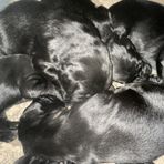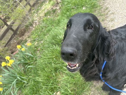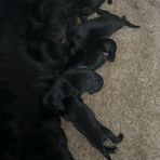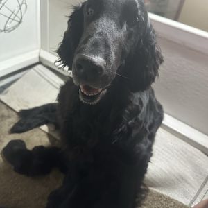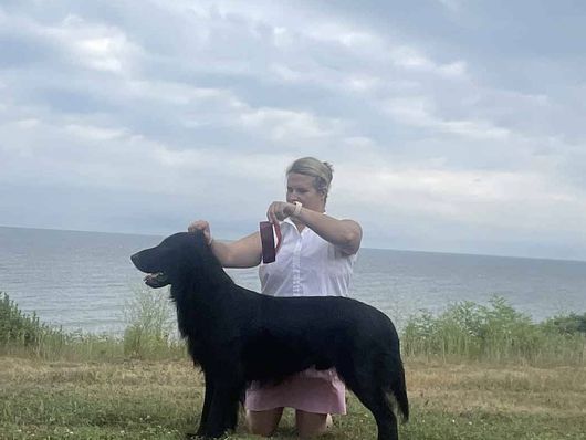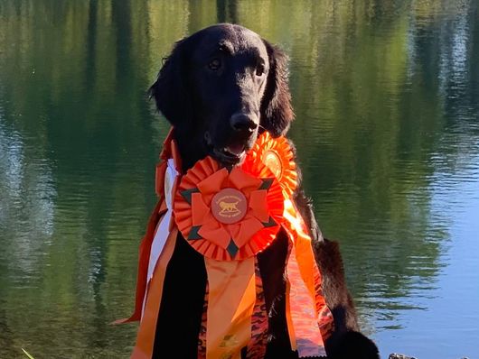 Violet is a member of the Flat Coat Hall of Fame meaning she has achieved multiple titles and Championships in conformation, obedience, rally, agility and field! She loves to please. She is very easy going! She lives in the house with our 11 other dogs.