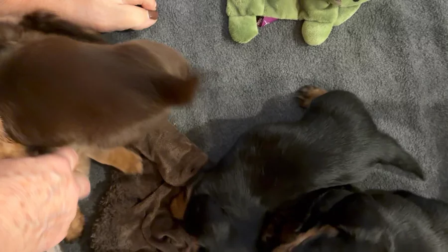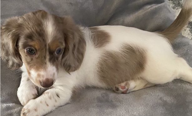 Our puppies include chocolate and tan, black and tan, and dapple. Colors will vary depending on the parent dogs.