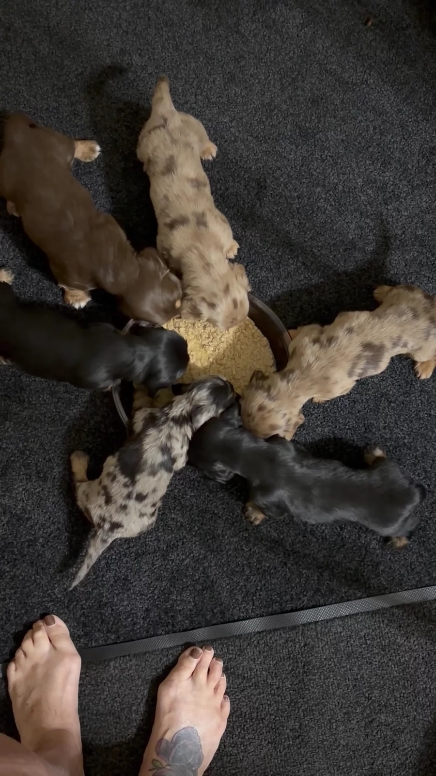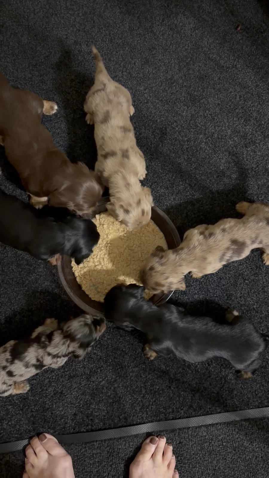 All of the puppies are doing great! We introduced solid food and they’re loving it!