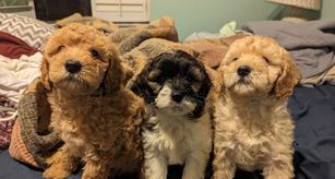 Our Cavapoo puppies include red, cream, black and white, and apricot. Goldendoodle puppies include cream, apricot, chocolate, and parti. Colors will vary depending on the parent dogs.