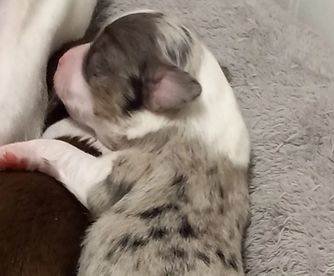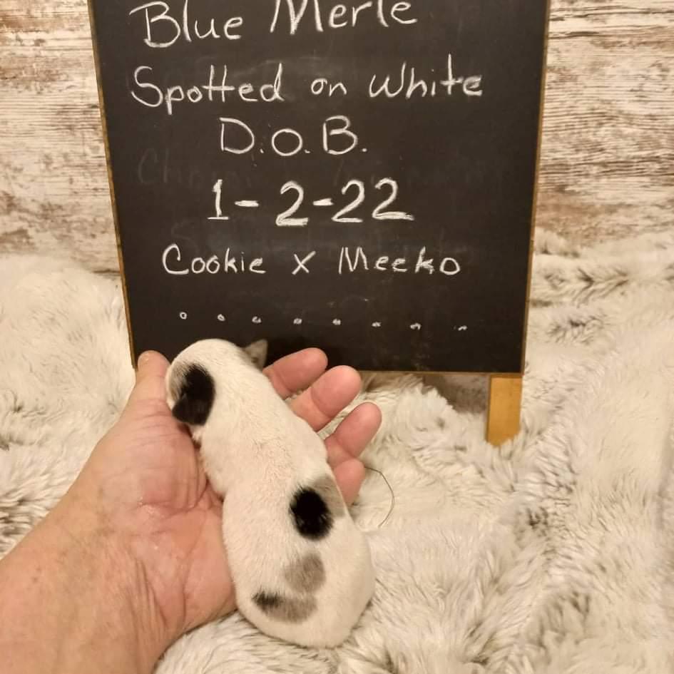 Lacey is a beautiful tan spotted on white Merle, she carries one longhaired gene and one smooth coat gene so she has the potential to have pups with both coat types.